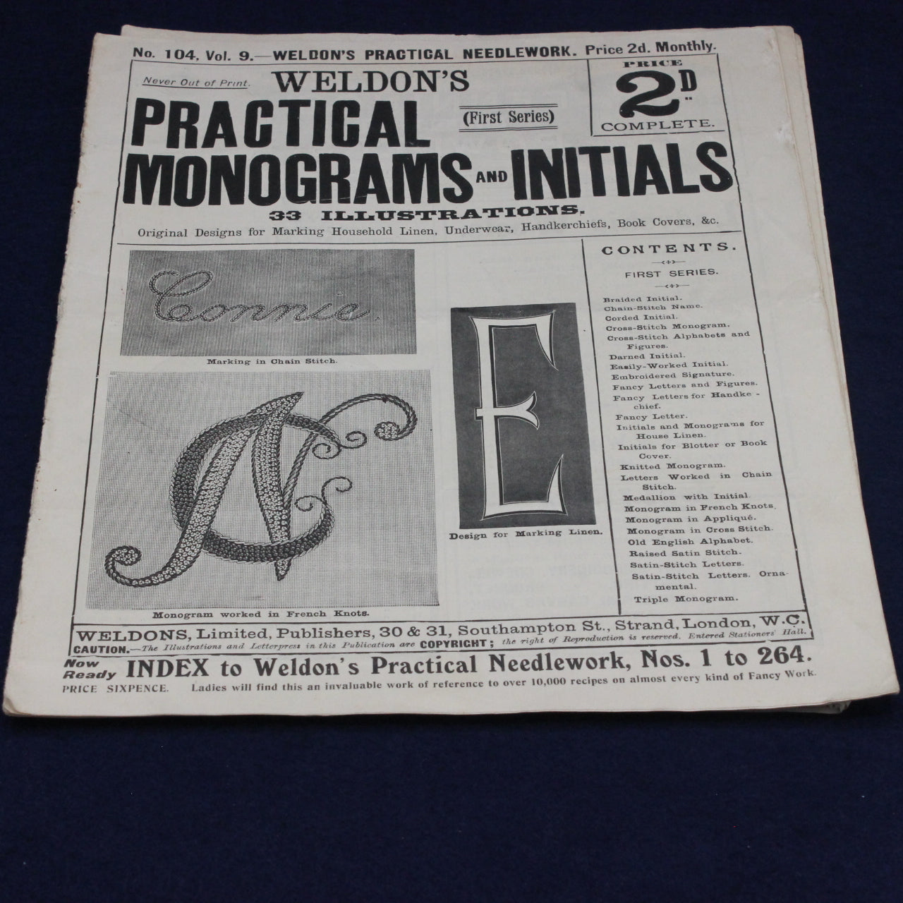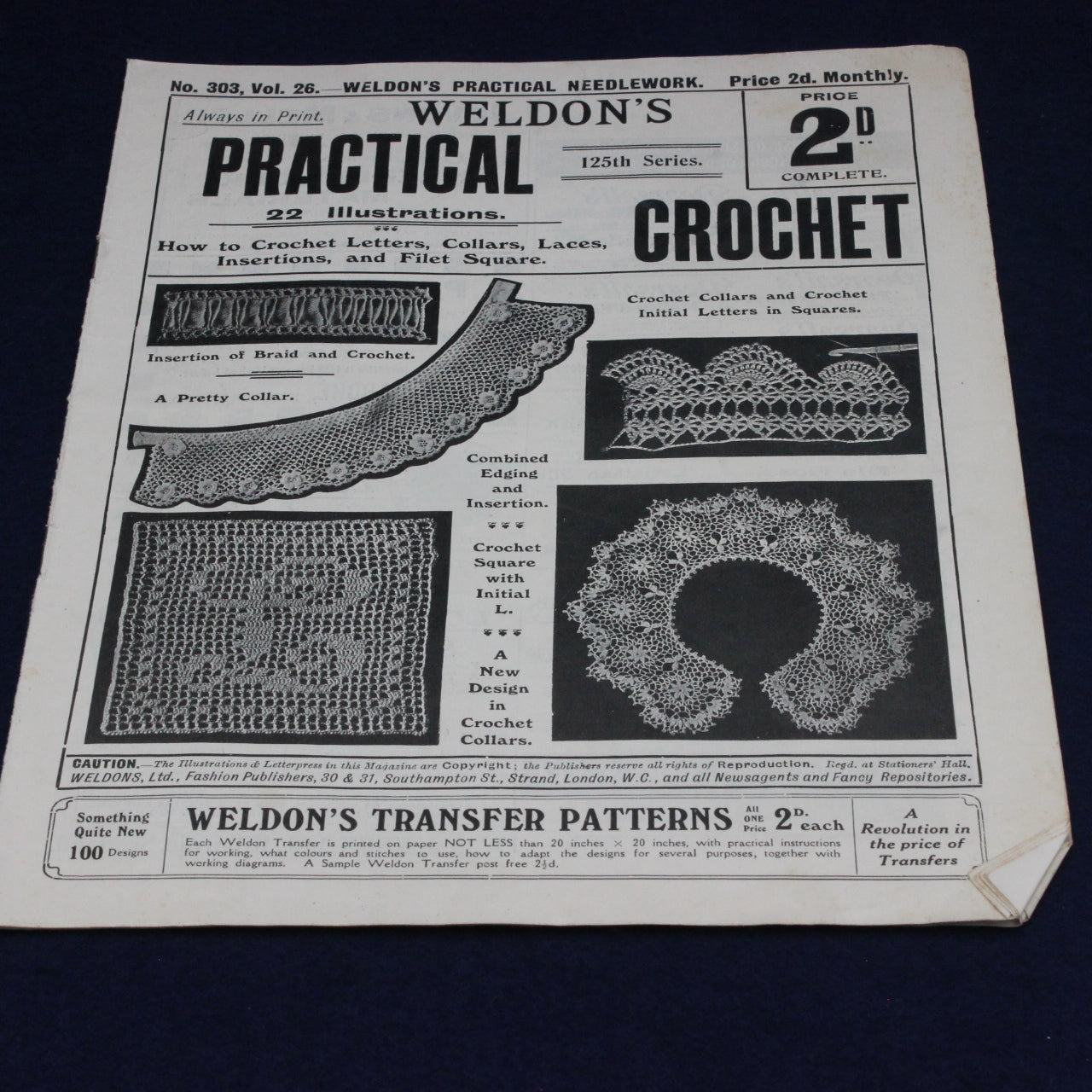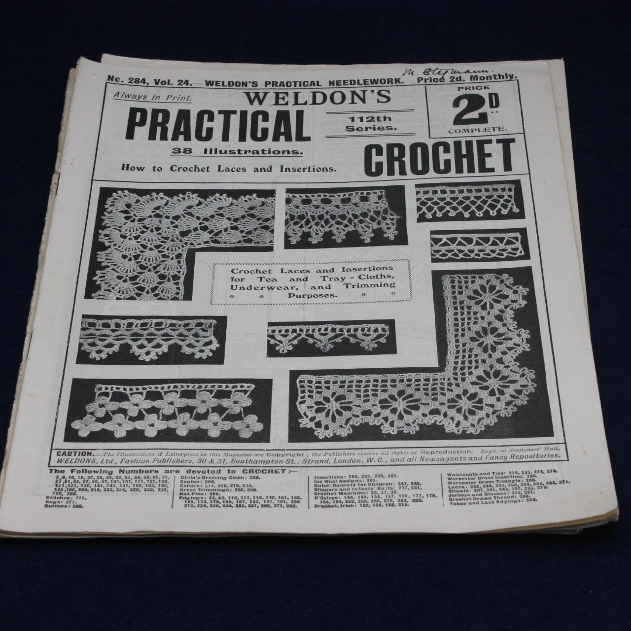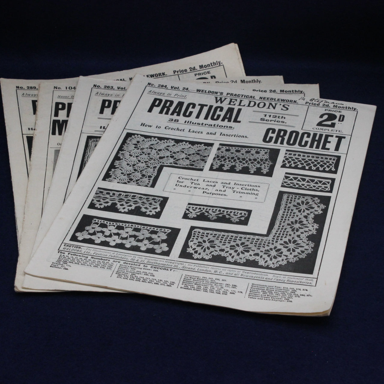 These booklets reflect a time when needlecraft was both a practical skill and a creative outlet, with crochet lace and insertions used to embellish garments, tea cloths, tray cloths, and household linens. Today, Weldon’s publications are valued not only for their patterns but also for their insight into the domestic artistry and textile traditions of the period.