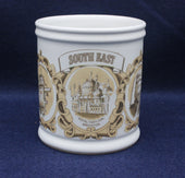 White mug with decorative brown design featuring 'South East' and a building on a blue background