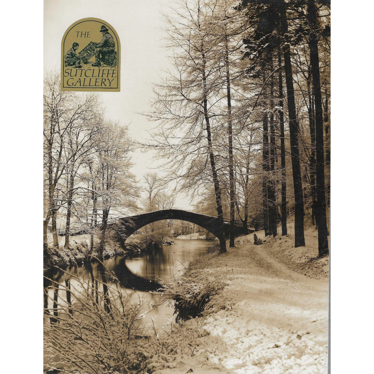A nostalgic vintage print from The Sutcliffe Gallery, Whitby, titled Beggar’s Bridge. The image depicts a wintery scene of the historic stone bridge arching over the river, with a winding path to the right and tall bare trees rising above. The composition captures the quiet stillness of the season, blending architectural heritage with the natural beauty of the Yorkshire landscape.