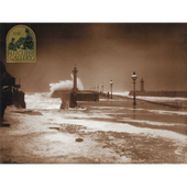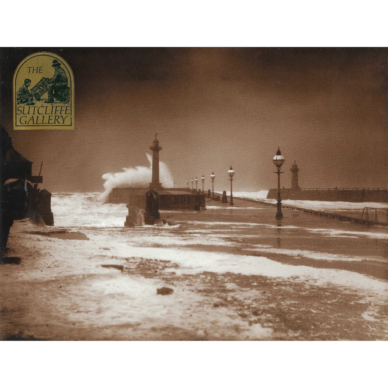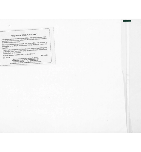 A striking vintage print from The Sutcliffe Gallery, Whitby, titled High Seas on Whitby West Pier. The image depicts waves tumbling and crashing over the pier itself, capturing the raw power of the North Sea as it surges against Whitby’s coastal structures. The composition conveys both drama and resilience, reflecting the town’s enduring relationship with the sea.