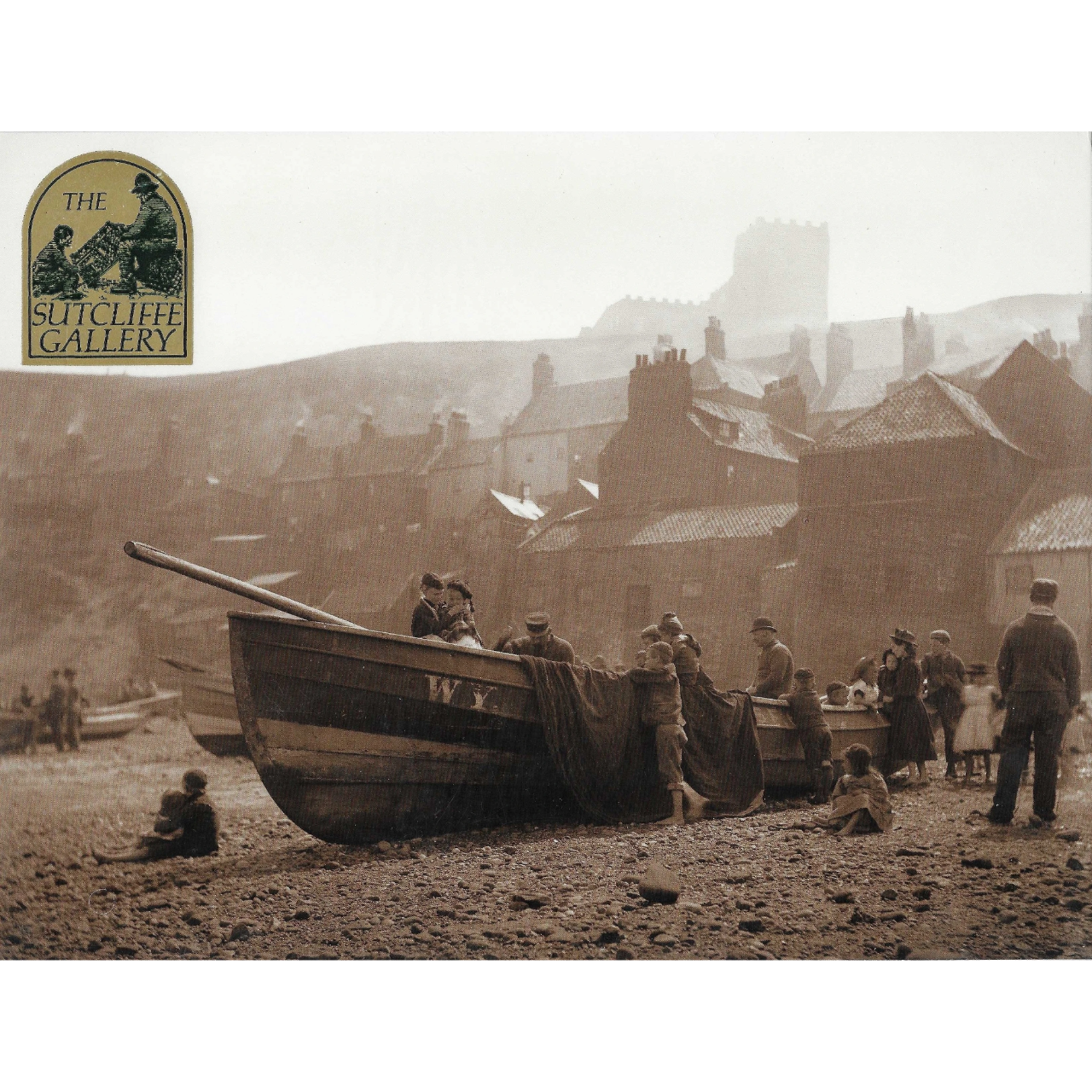 A nostalgic vintage print from The Sutcliffe Gallery, Whitby, titled Under the Wing of St Mary’s Church. The image depicts a beached boat with figures gathered nearby, set against the backdrop of Whitby’s iconic St Mary’s Church. The composition beautifully balances maritime labour with the enduring presence of the church overlooking the harbour, symbolising both community and continuity.
