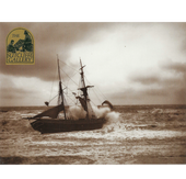 A dramatic vintage print from The Sutcliffe Gallery, Whitby, titled The Flag of Distress. The image depicts a Whitby sailship fishing vessel caught in heavy seas close to the beach, its tall sails straining against the waves. The composition conveys the peril and vulnerability of the vessel, highlighting the raw power of the sea and the precarious nature of maritime life.