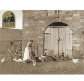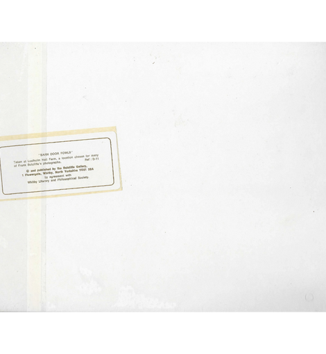 A nostalgic vintage print from The Sutcliffe Gallery, Whitby, titled Barn Door Fowls. The image depicts farmyard hens gathered at the barn door, a timeless rural scene that captures the everyday rhythms of countryside life.