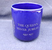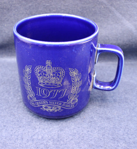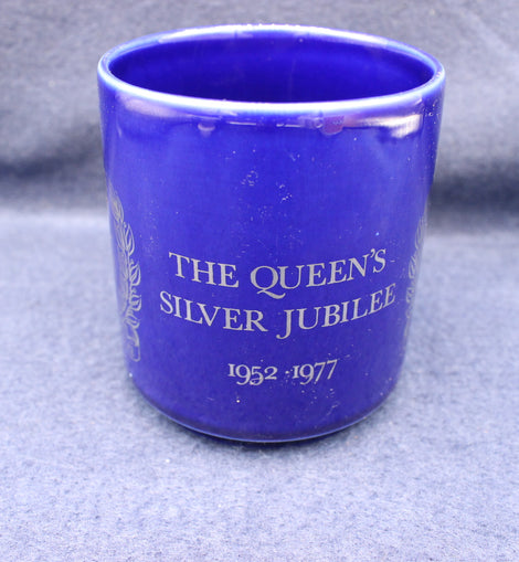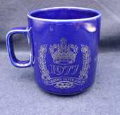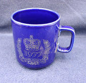 Exquisite royal blue commemorative mug to celebrate Queen Elizabeth II Silver Jubilee. 1977 mug in unused excellent condition with complimenting silver decals and text.