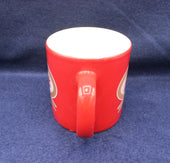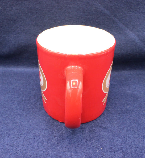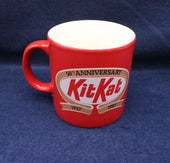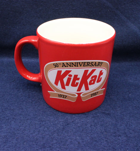 Celebrating 50th year of the chocolate covered biscuit called KitKat, this 1987 collectors mug is bright red with a gold accent. Red KitKat logo on a white background.
