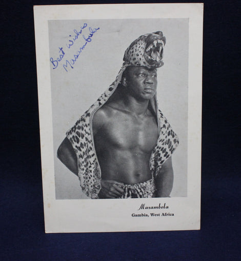Bradford wrestler Masambula made his debut in 1952 and was much loved by his audiences. He appeared in a full leopard skin, with his trademark headstand against the corner post, rare autographed print 12.5 x 18cm