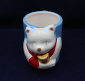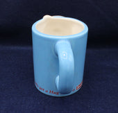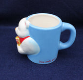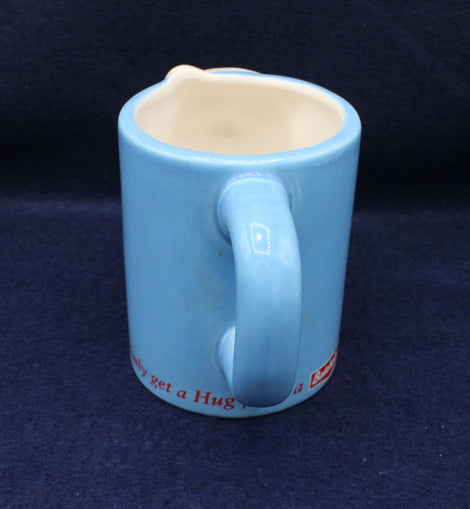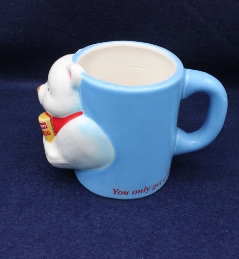 Batchelors Hug Mug with raised white bear wearing a red scarf on the front. The bear is holding a mug with Batchelors Hug Mug text on it. Red text under the handle "You only get a hug from a Batchelors Mug". Nice condition.
