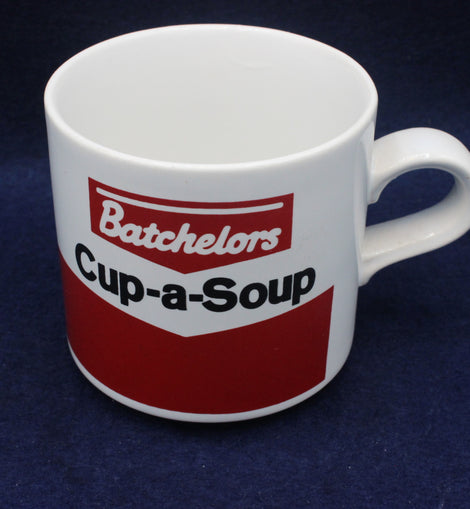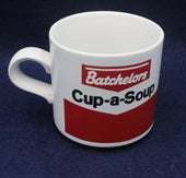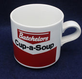 White mug with Batchelors Cup-a-Soup logo on a dark red background. Cup-a-soup fan collectors mug.