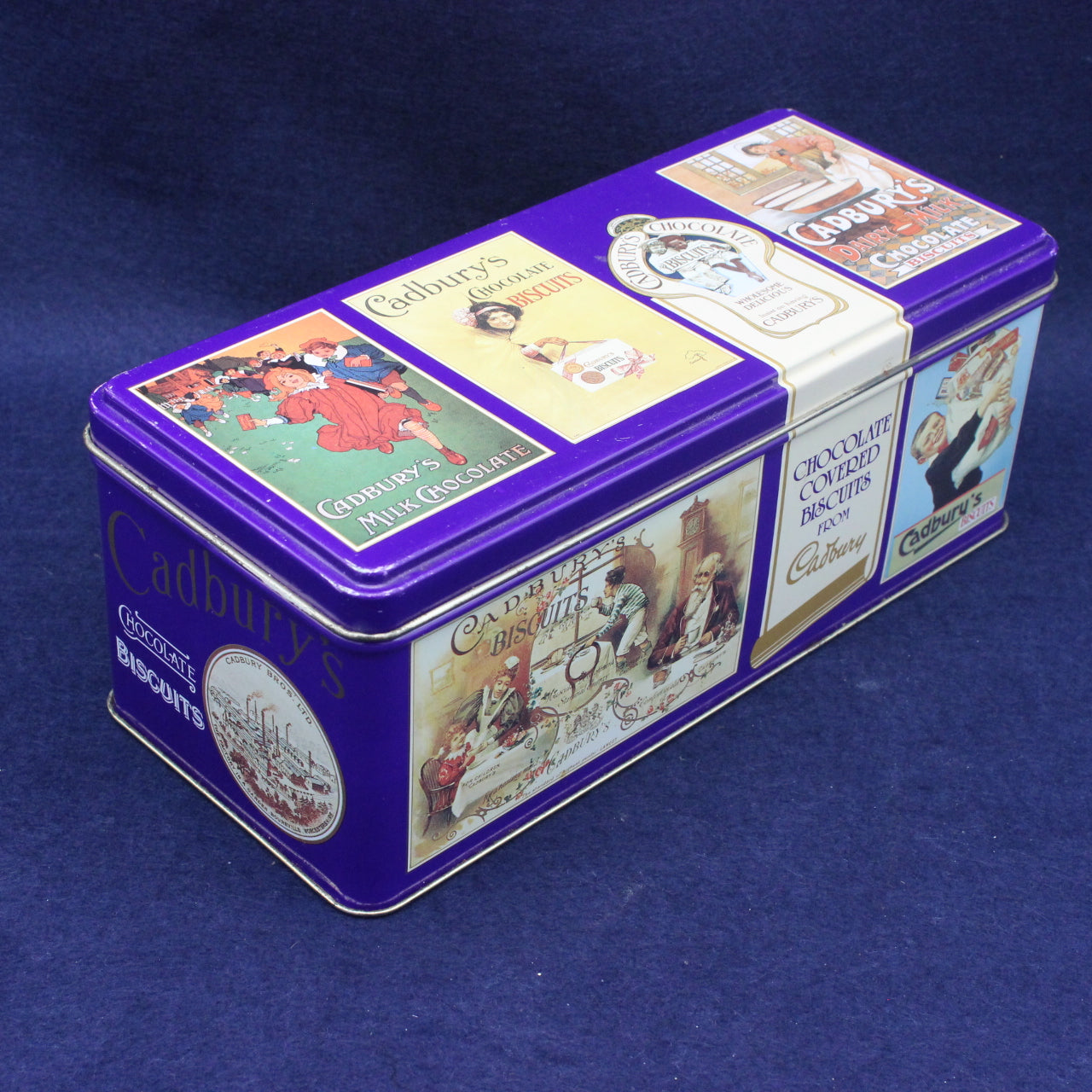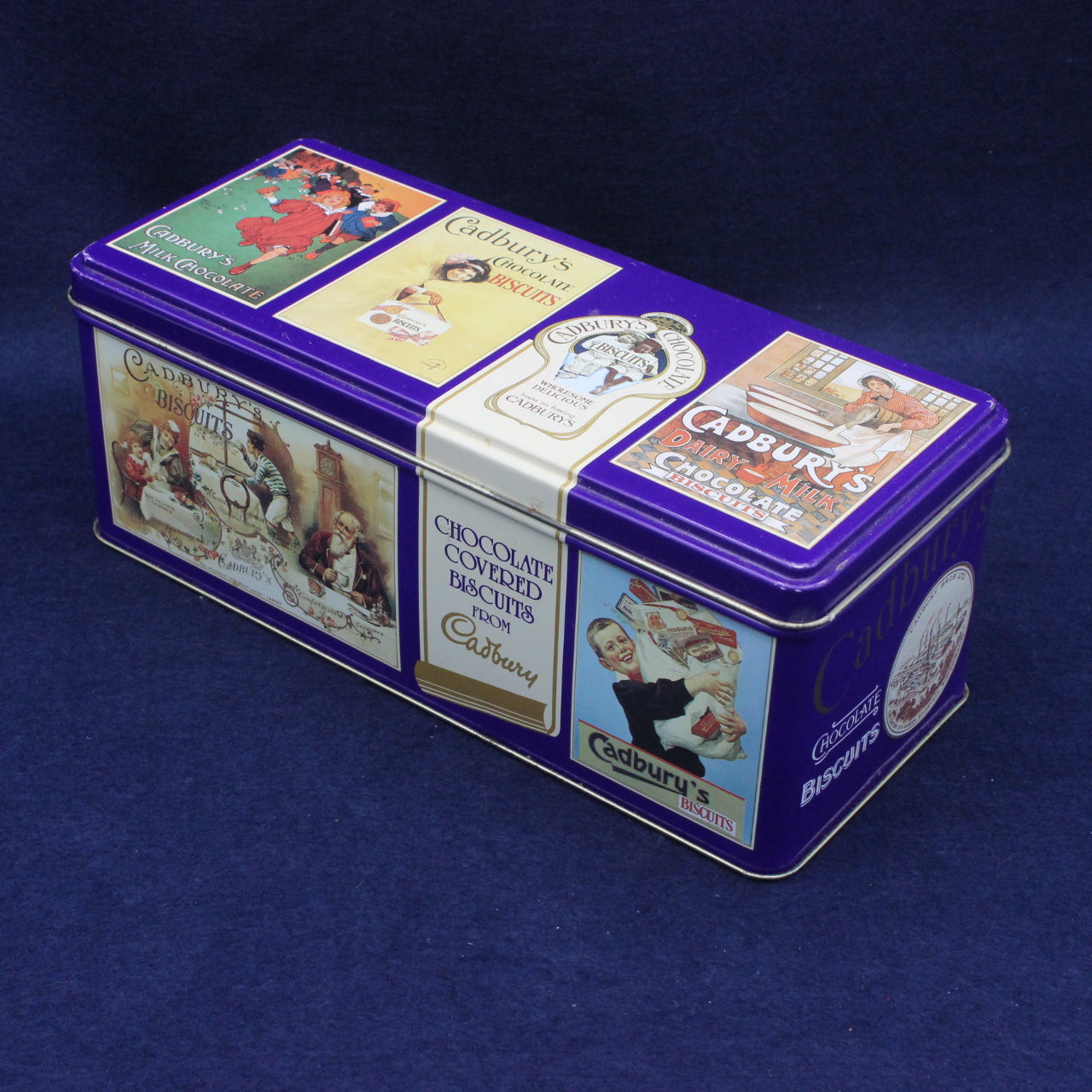 Bring a touch of classic British charm to your home with this vintage Cadbury’s biscuit tin, styled with the rich colours and elegant design that defined the brand’s mid‑century packaging. Compact and beautifully detailed, it captures the timeless look of Cadbury’s early promotional tins — the kind once found in family kitchens, sweet shops and holiday hampers across the UK.