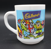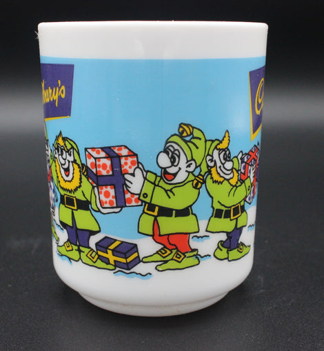 Child's sized mug advertising Cadbury's with Father Christmas and elves packing his sleigh with Christmas presents.
