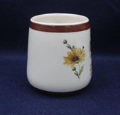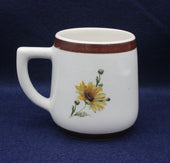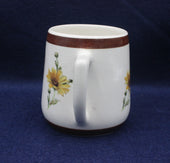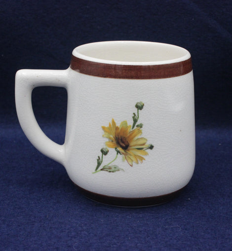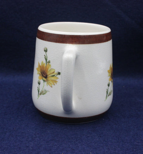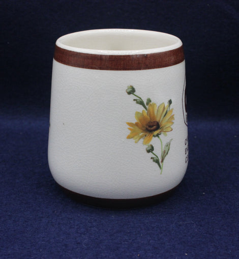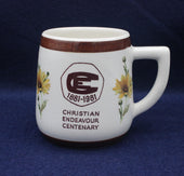 Floral design crackle glaze mug with chocolate brown rim. produced to celebrate the Christian Endeavour Centenary 1881-1981. 83mm high