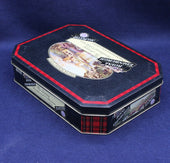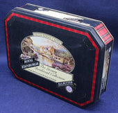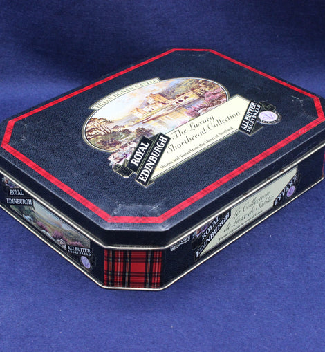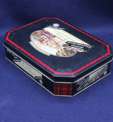 This vintage Scottish shortbread tin features a striking image of Eilean Donan Castle, one of Scotland’s most iconic and photographed landmarks. Produced for the Royal Edinburgh shortbread range, the tin combines classic souvenir styling with a bold scenic illustration, framed by traditional decorative borders.