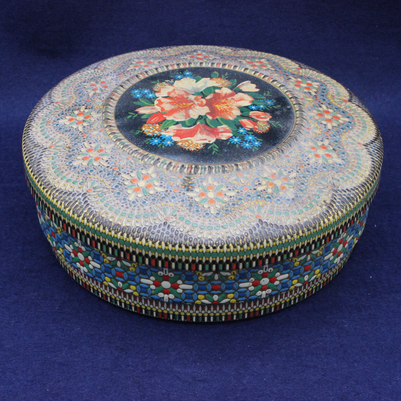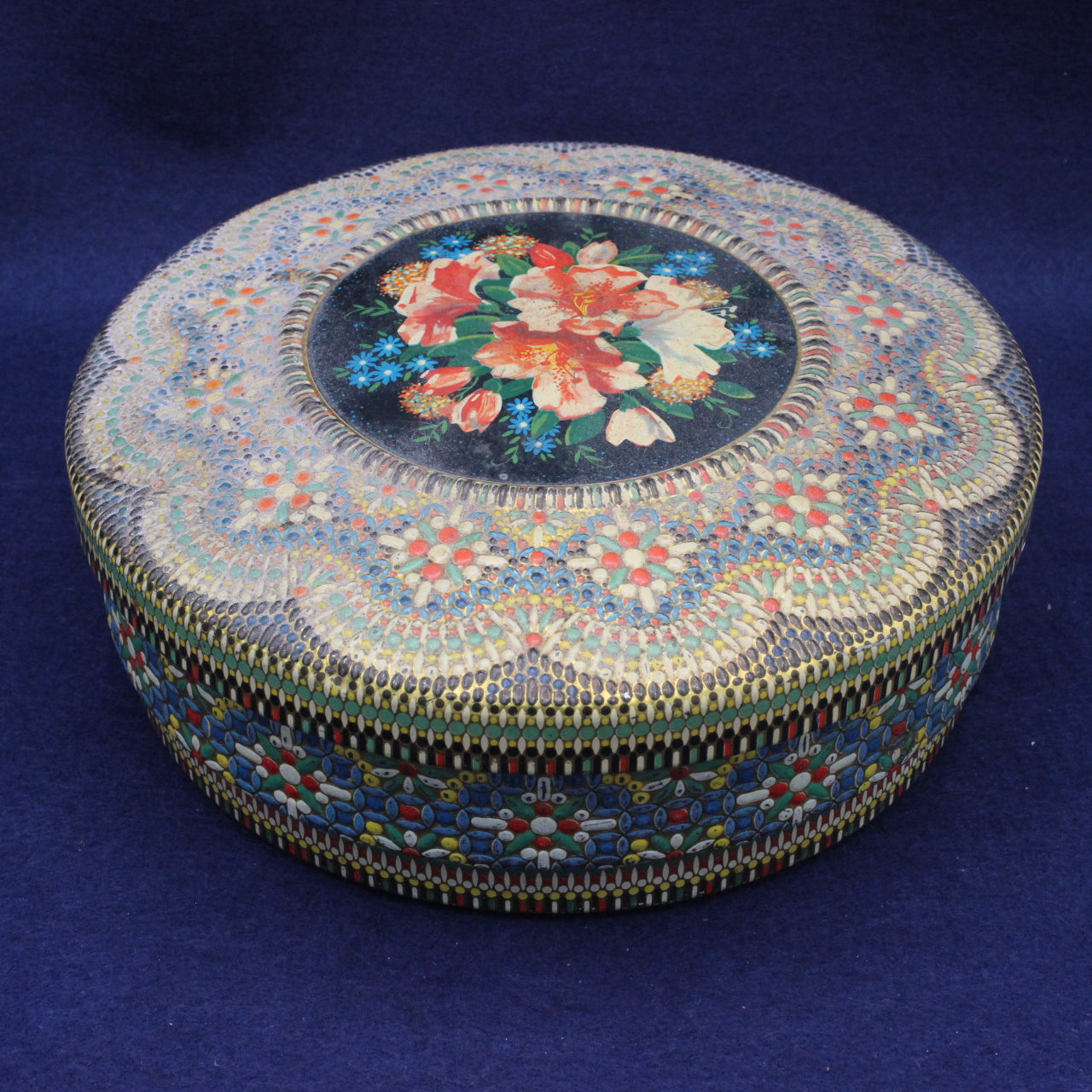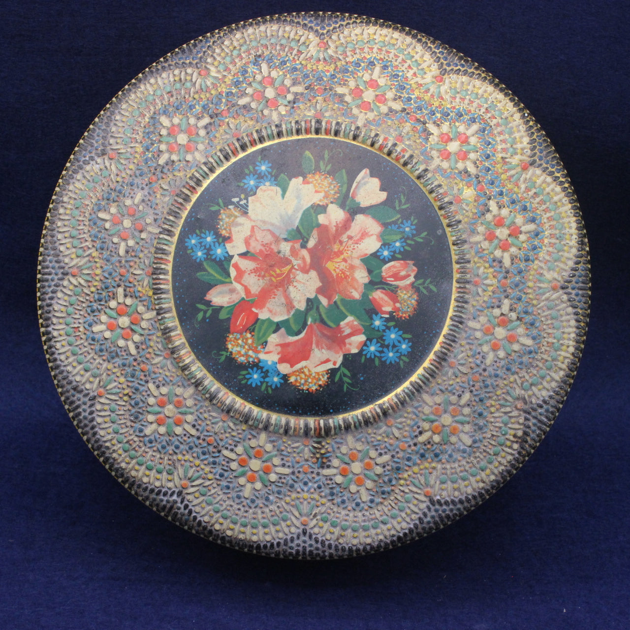 This tin fits this tradition perfectly — a decorative floral centre framed by a raised, patterned surround, giving it both visual depth and tactile appeal.