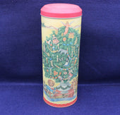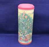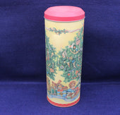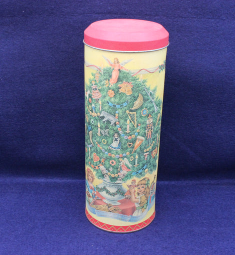 Christmas themed round and tall tin from Foxes Cookies. A large laden Christmas tree image with children and presents under the tree. Approximate Size 24cm high by 9cm wide
