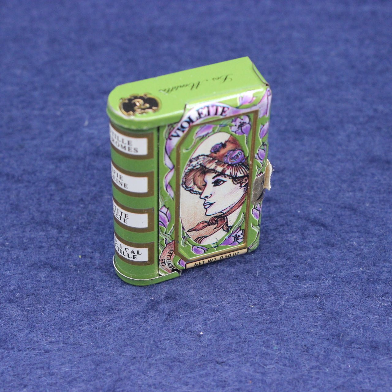 A beautifully designed vintage French Violet Pastilles tin featuring an elegant lady’s portrait framed by a delicate botanical border, most likely stylised violets. The spring‑loaded flip lid and the net weight printed in ounces on the front suggest this was produced for export, while the ingredient list on the reverse appears without a barcode — a strong indicator of 1960s–early 1970s manufacture.