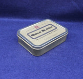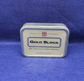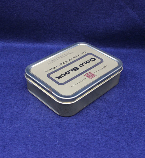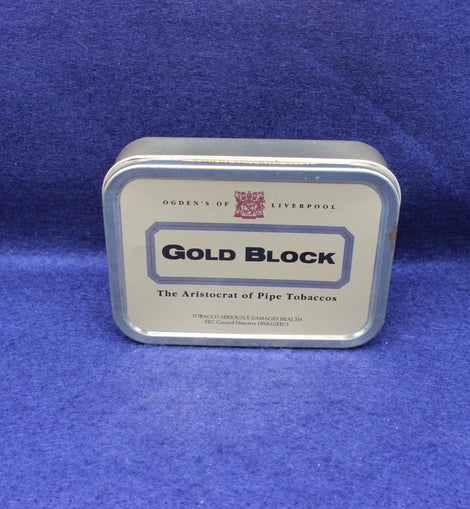 A two tone gold tobacco tin. Ogdens of Liverpool red crest. Gold Block branding in black. The Aristocrat of Pipe Tobacco small slogan.