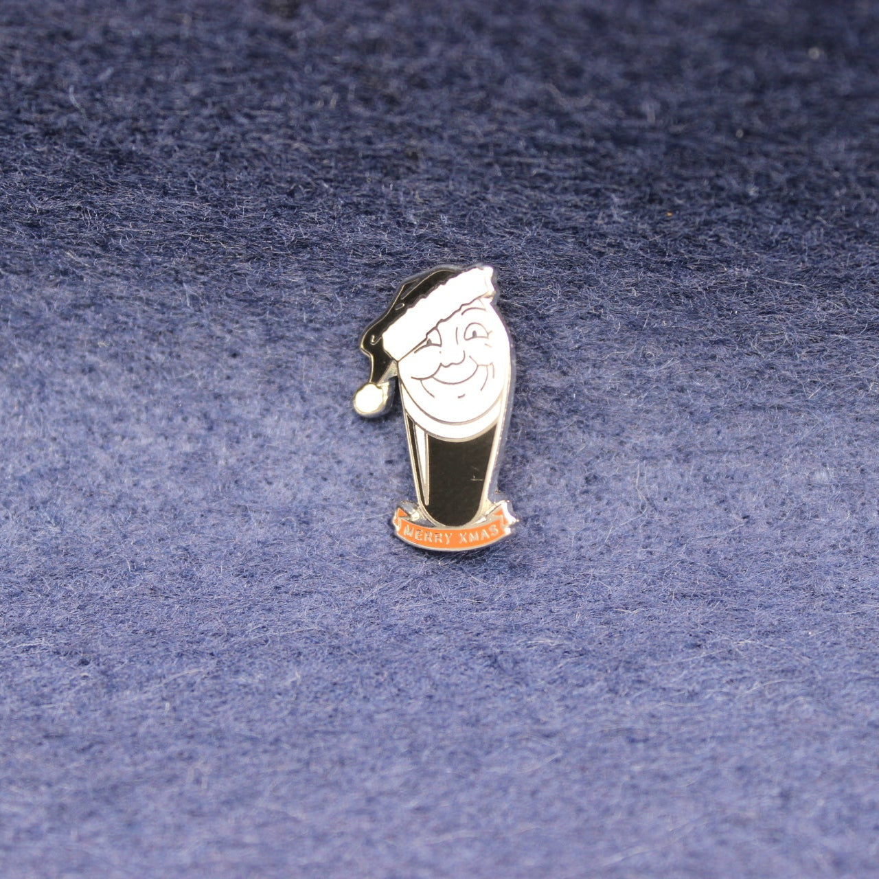 A cheerful vintage enamel pin featuring a smiling pint‑glass character wearing a Santa hat, finished with a bright red banner reading “MERRY XMAS”. The playful design echoes the light‑hearted promotional style often seen in pub and brewery Christmas giveaways, making it a charming seasonal collectible for fans of Guinness‑themed or beer‑themed memorabilia.