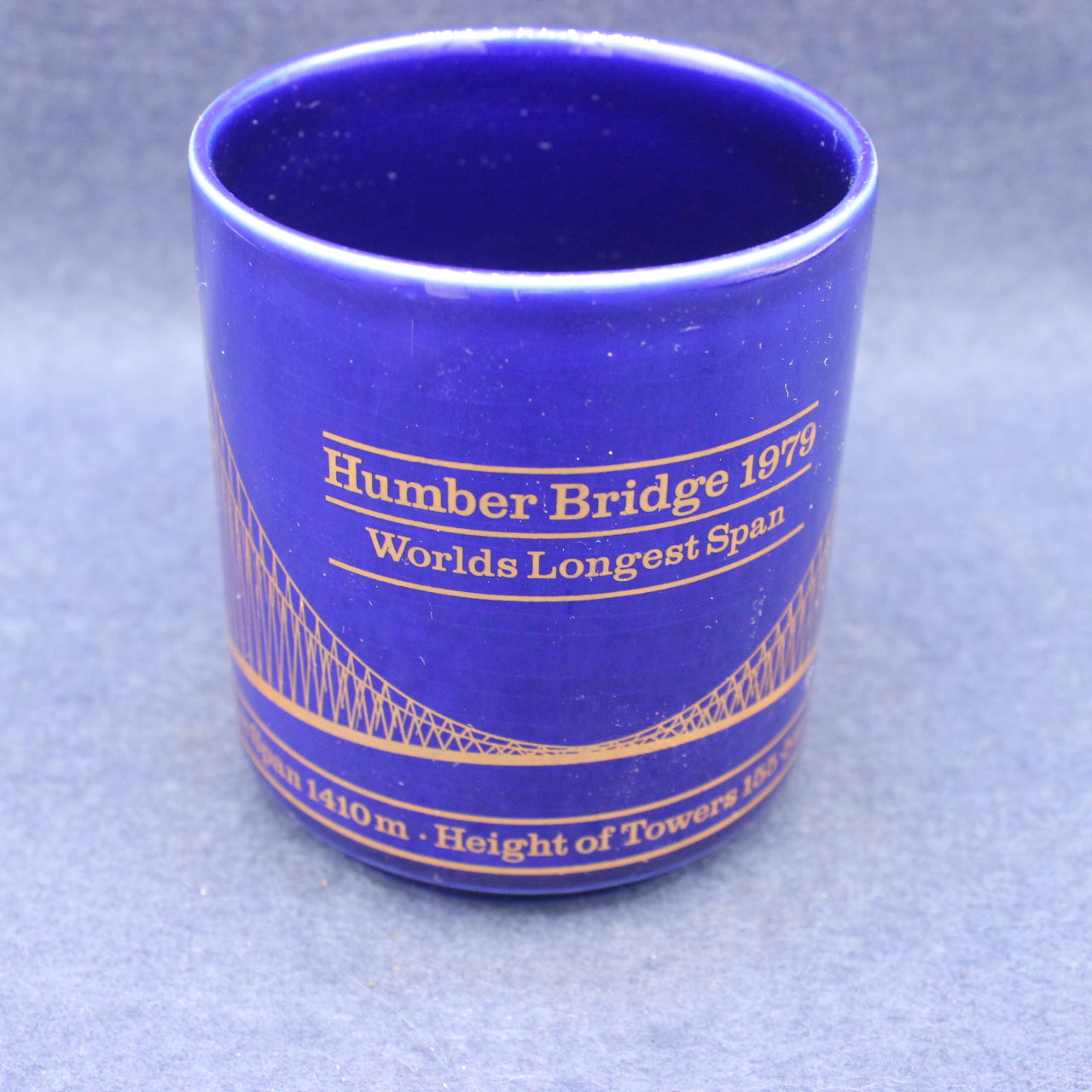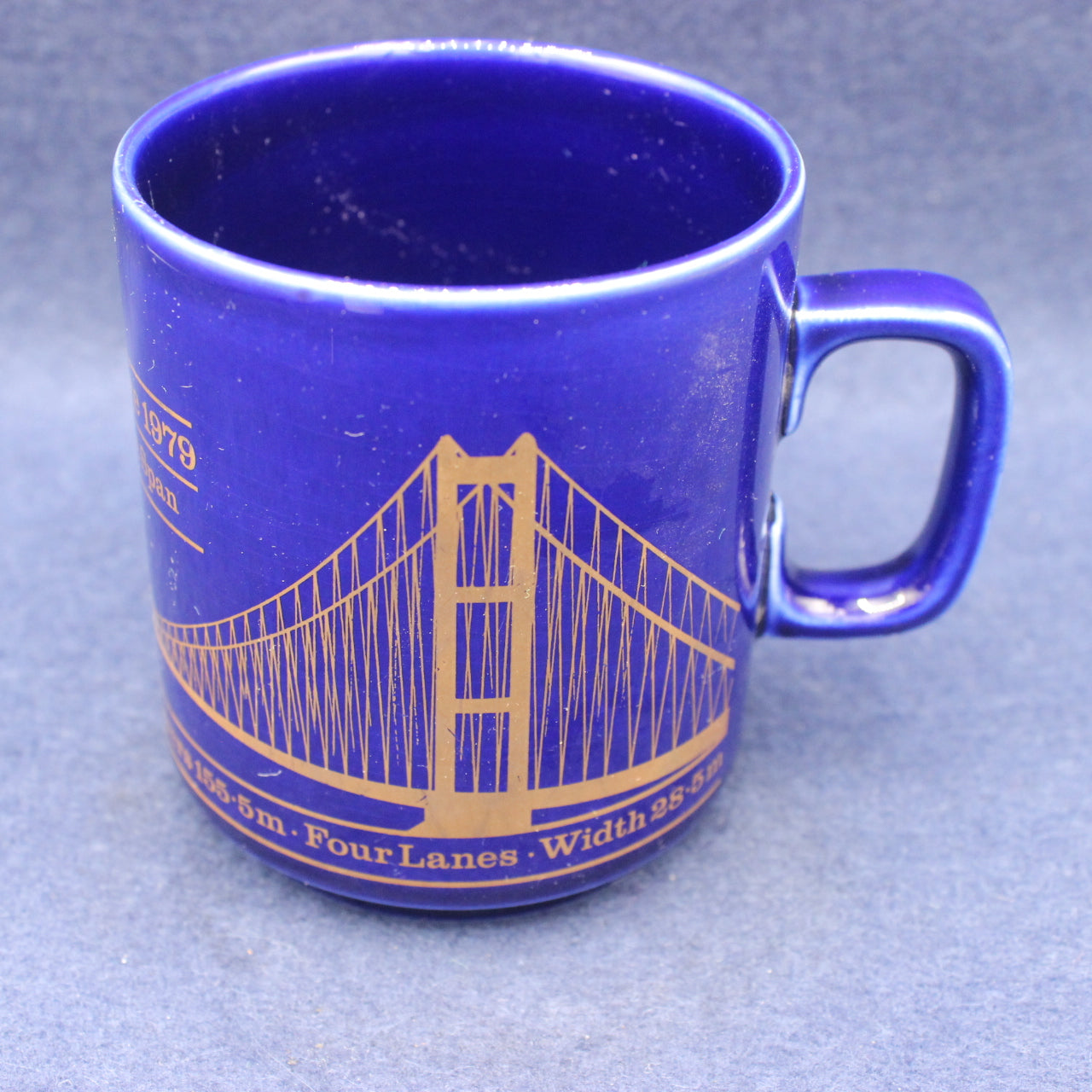 A commemorative ceramic mug celebrating the opening of the Humber Bridge in 1981. Decorated with bold gold lettering and imagery of the iconic suspension bridge, with specifications around the base, it captures the pride of one of Britain’s greatest engineering achievements. A distinctive collectible for enthusiasts of British landmarks, regional heritage, and retro kitchenware.