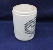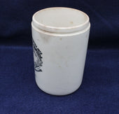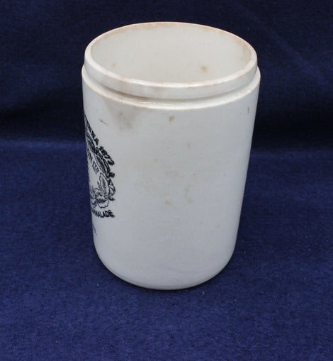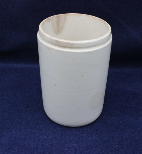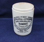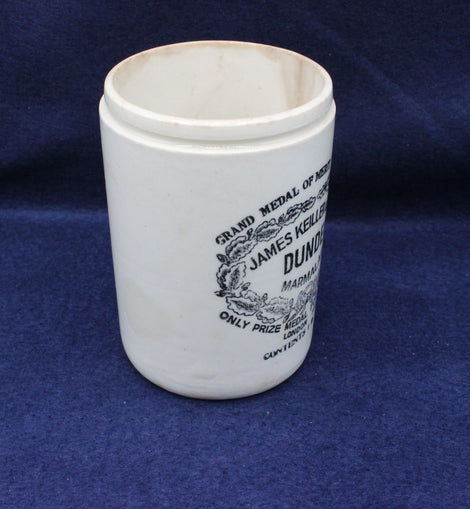 James Keiller Dundee marmalade pot. Horizontal groove running below the rim to take the string that kept the wax paper or cloth lid in place. Well aged pot.