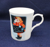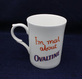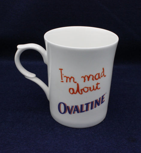 Kingsbury fine bone china Ovaltine mug. Vintage picture of a child drinking Ovaltine and holding a small blackboard with I'm mad about Ovaltine written on it. Slogan repeated on the rear.