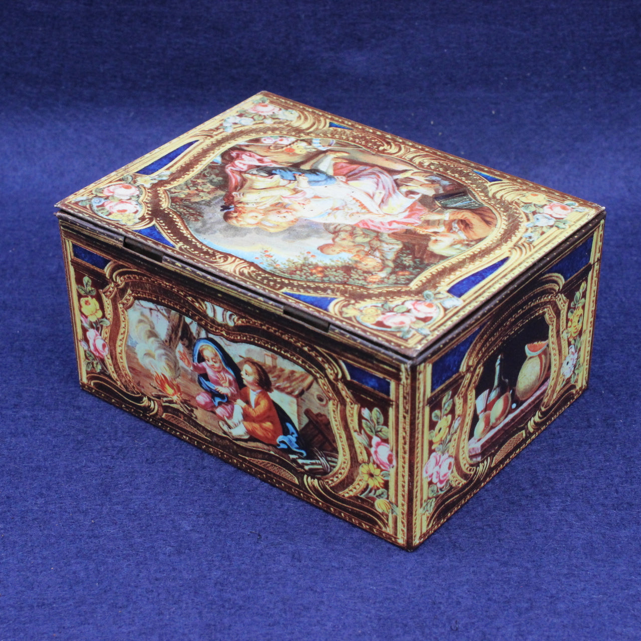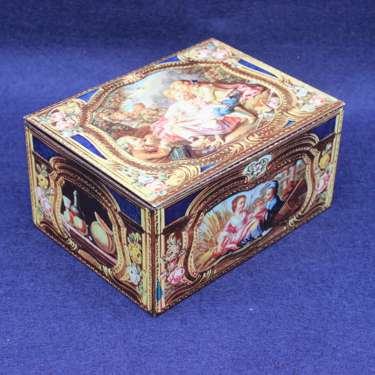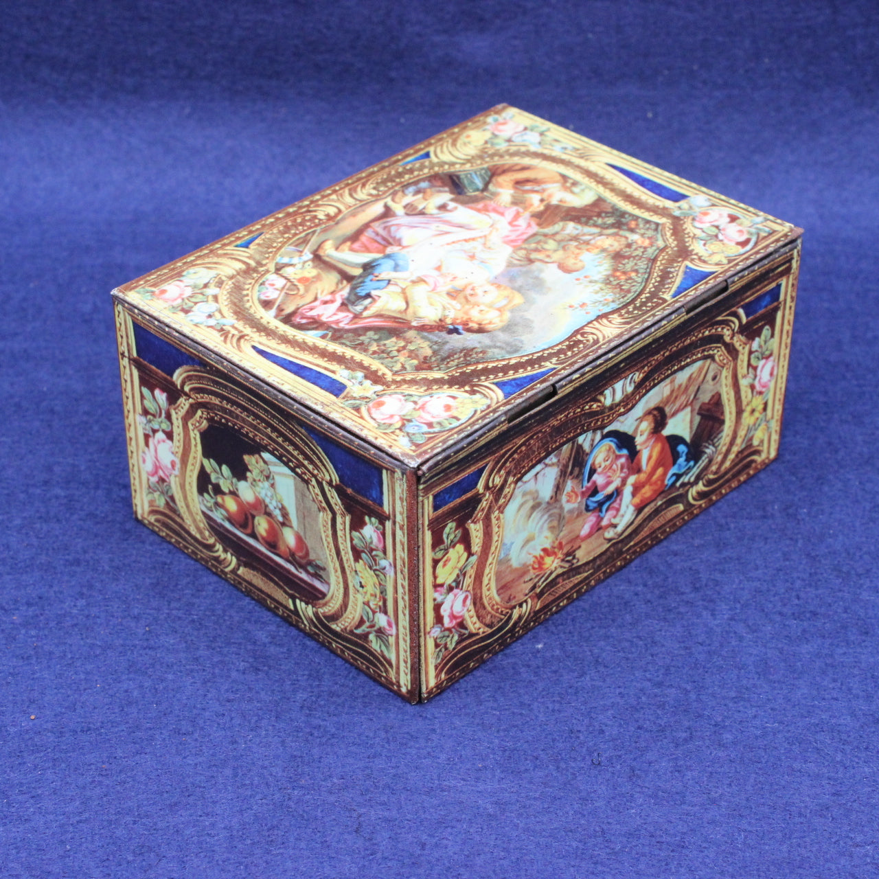 This charming small tin is styled as an antique casket, stamped with both Kemps Chocolate Biscuits and Barker & Dobsons Chocolates. A reproduction of an 18th‑century French snuff box originally crafted in gold enamel circa 1760–1761, it captures the elegance of Rococo design in miniature form.