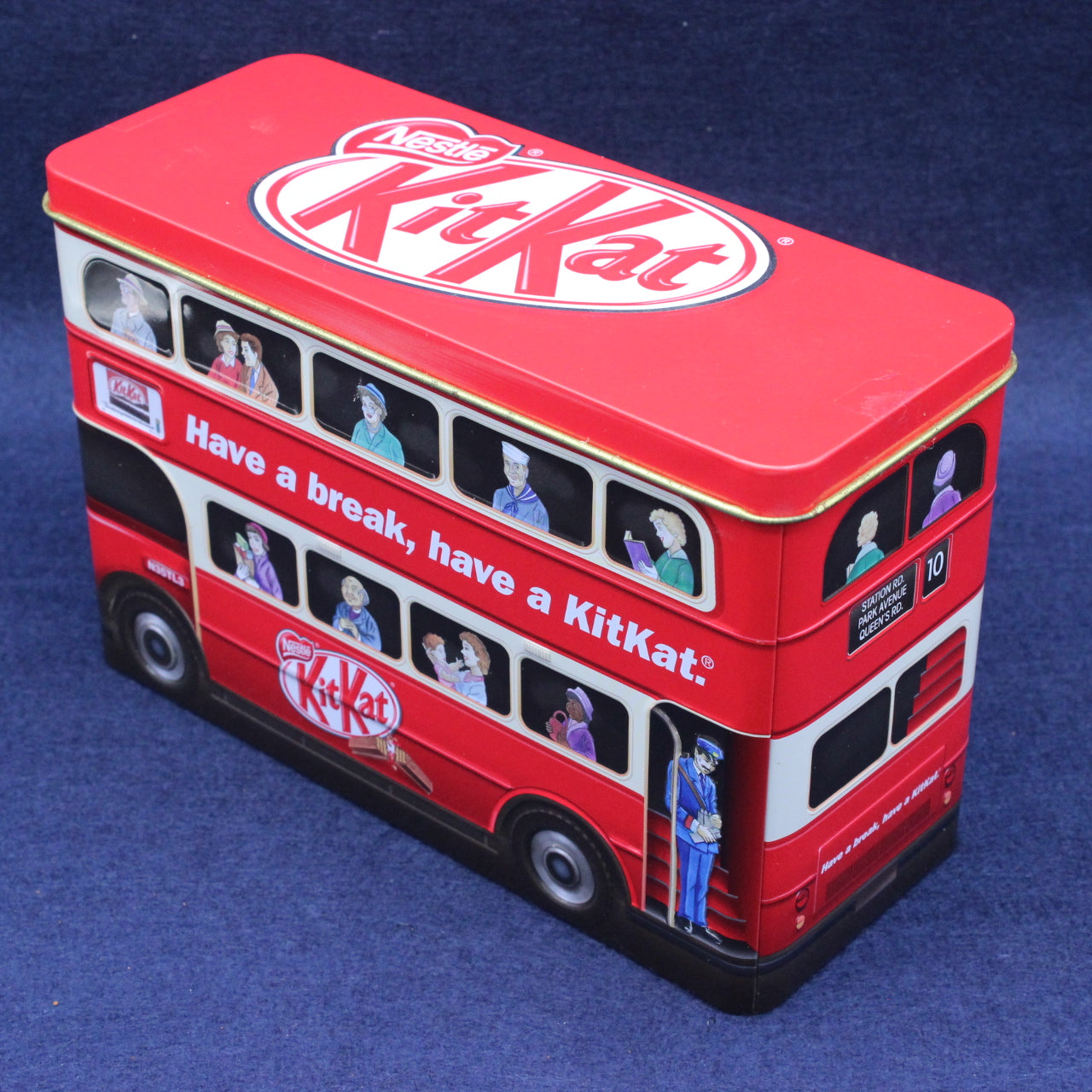 Produced by Nestlé, the tin features bold KitKat branding across its sides, detailed bus windows, and a playful number plate, making it both a functional biscuit tin and a nostalgic advertising piece.