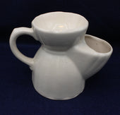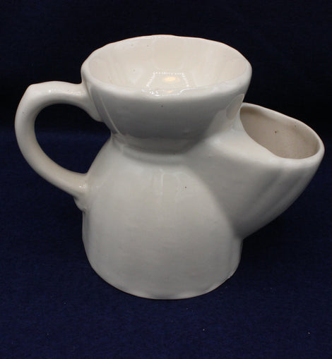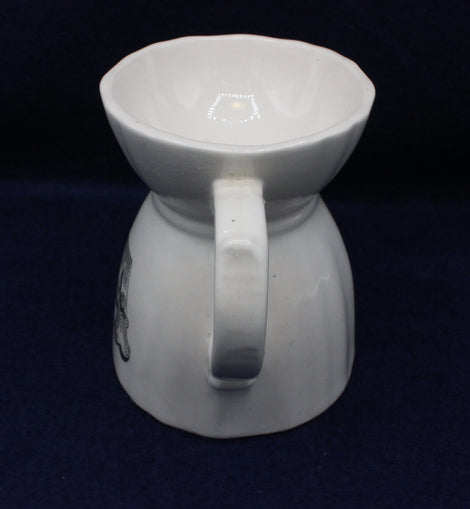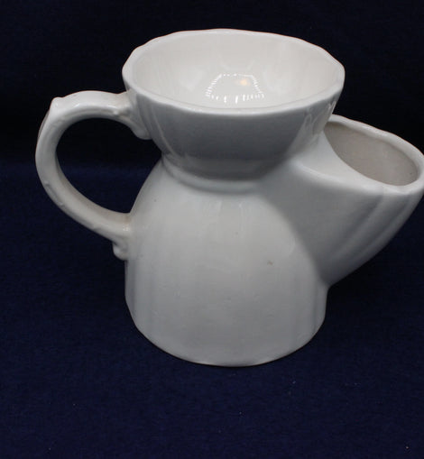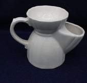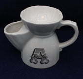 White ceramic tea pot with a large handle and decorative letter 'A'. Perforated top for serving and squeezing fresh lemon or other tea accompaniments to taste. Tea bags can also be conveniently removed and stored after brewing.