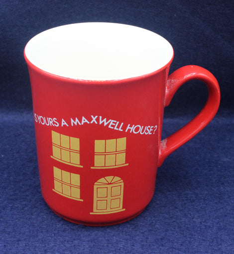 A vibrant bright red Maxwell House coffee mug. Gold doors and windows with white text making the roof: "Is Your's A Maxwell House?"
