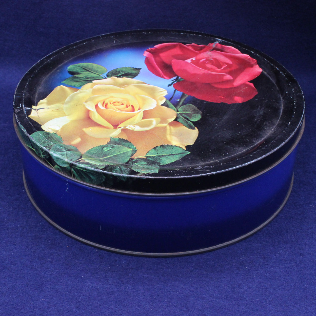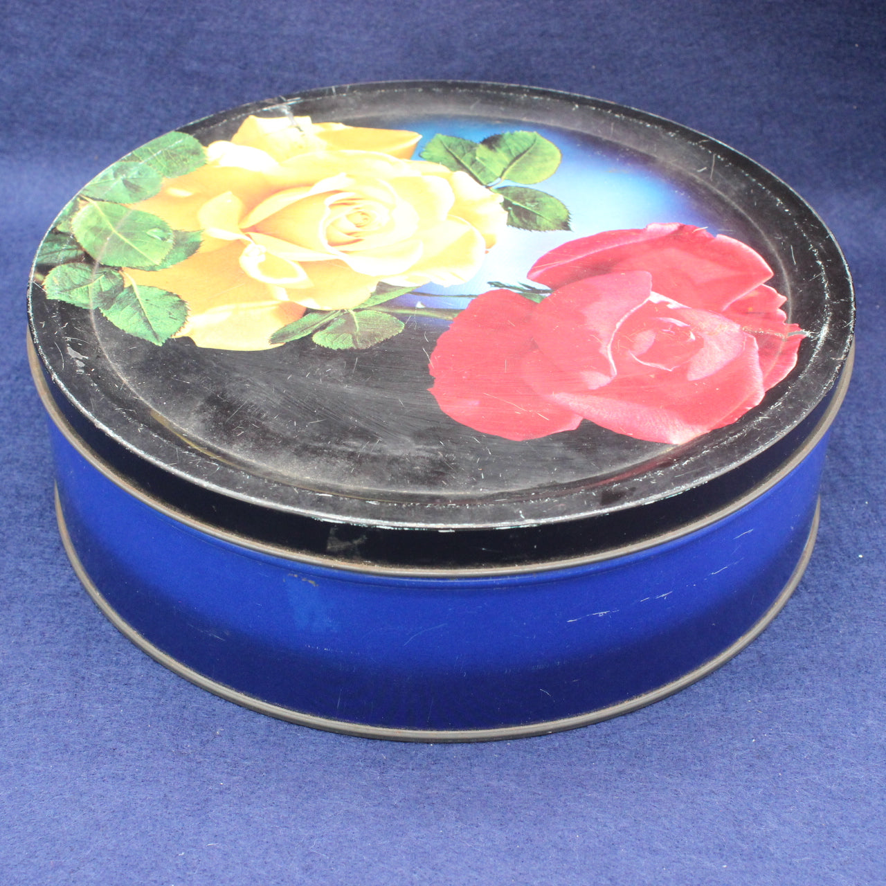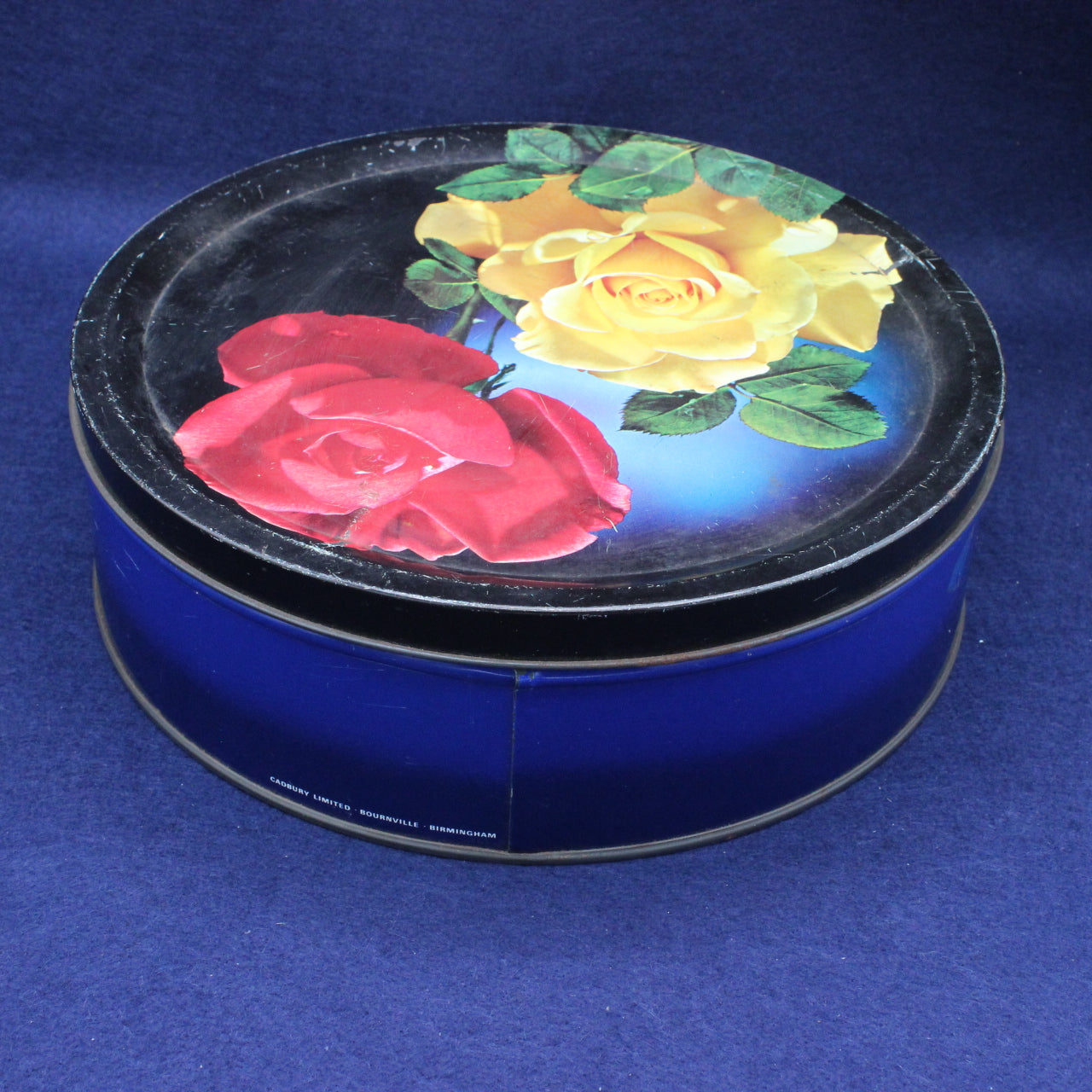 This well‑used vintage Cadbury Bournville biscuit tin is a wonderfully characterful piece of mid‑century British packaging. Decorated with bold red and yellow roses against a deep blue background, it carries that unmistakable Cadbury charm — warm, homely and instantly nostalgic.