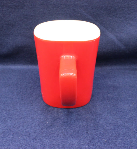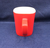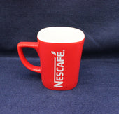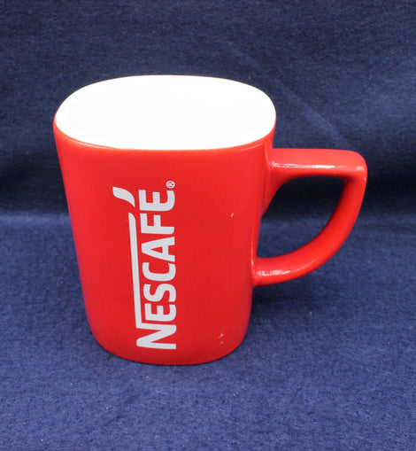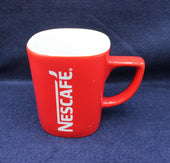 A bright red promotional mug for Nescafe Coffee. An unusual shape with white Nescafe branding.
