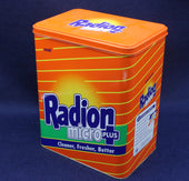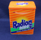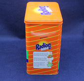 Its striking colour palette and classic Radion logo make it a standout display piece for collectors of laundry memorabilia, advertising tins, and retro household packaging. The early 1990s styling gives it strong nostalgic appeal, especially for those who remember Radion’s distinctive branding on supermarket shelves.