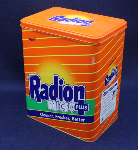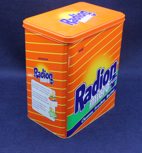 Radion was a well‑known British laundry detergent brand throughout the late 20th century, recognised for its bold packaging and strong visual identity. By the early 1990s, detergent companies increasingly used bright colours and high‑contrast graphics to emphasise cleaning power and freshness — a trend clearly reflected in Radion’s orange Micro PLUS range.