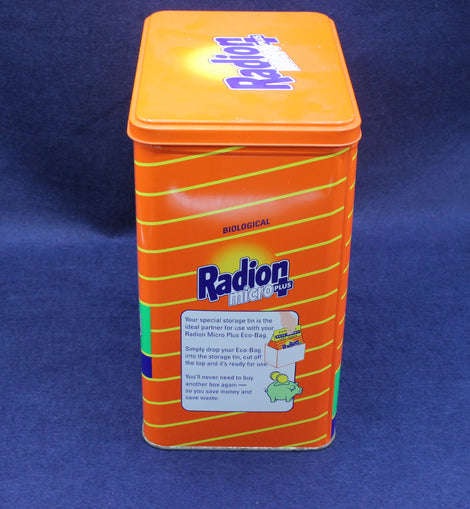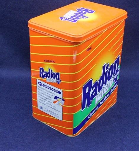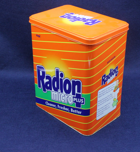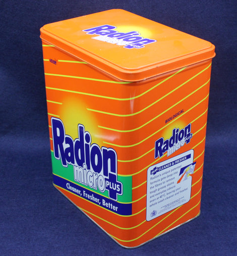 This Vintage early 1990s Radion Micro PLUS tin is a bold and vibrant example of British laundry packaging from the era. Finished in Radion’s unmistakable bright orange with crisp white and blue branding, it perfectly captures the energetic, high‑impact design style used for detergents in the early ’90s. The tin was originally produced as a reusable storage container for Radion Micro PLUS washing powder, offering customers a durable alternative to cardboard boxes.