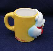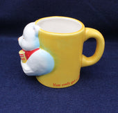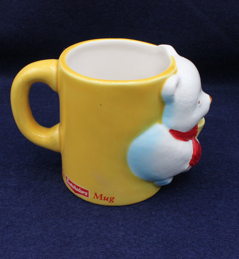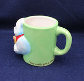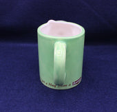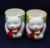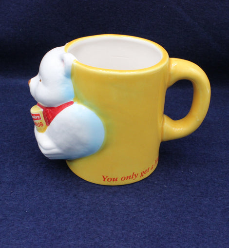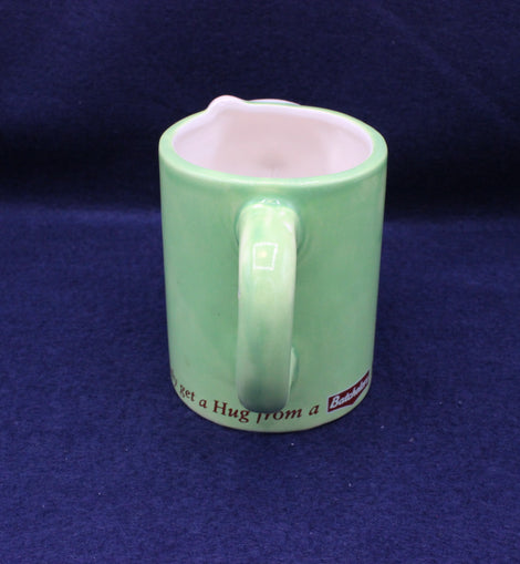 Pair of Batchelors Hug Mugs with raised white bears on the front. The bears are holding mugs with Batchelors Hug Mug on them. Red text under the handle You only get a hug from a Batchelors Mug. Nice condition. Very small glaze blemish on one green handle.