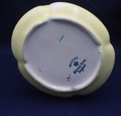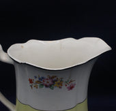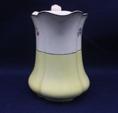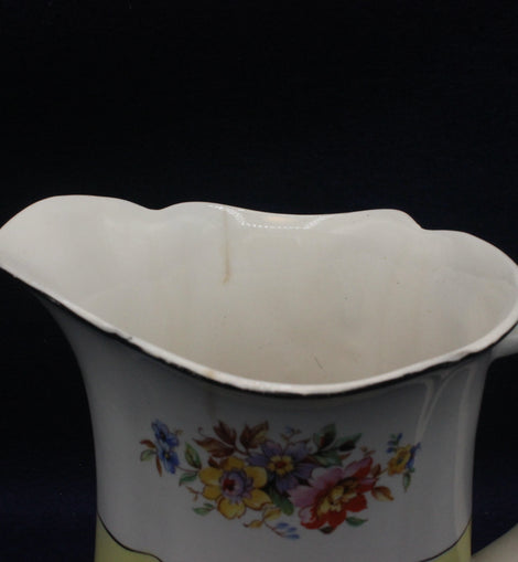 Upper half has pink yellow and blue flowers on a white background with a black edge to top lip. A black line divides the white upper from the delicate pale yellow base.