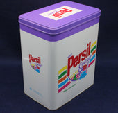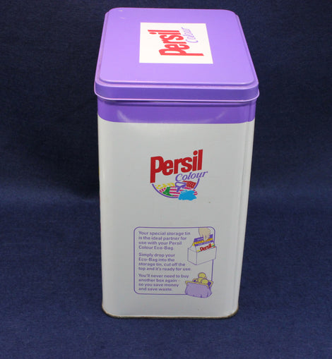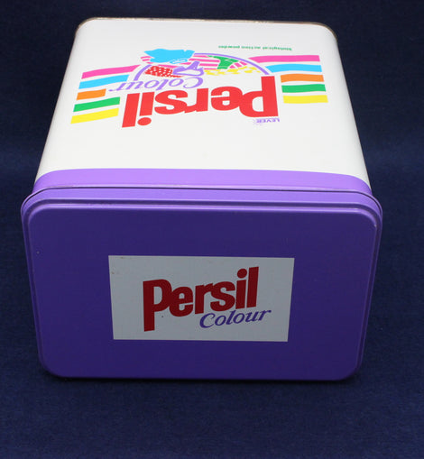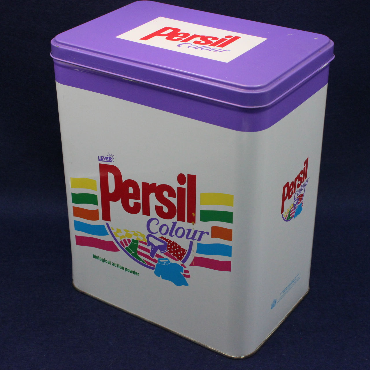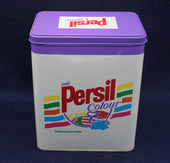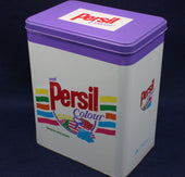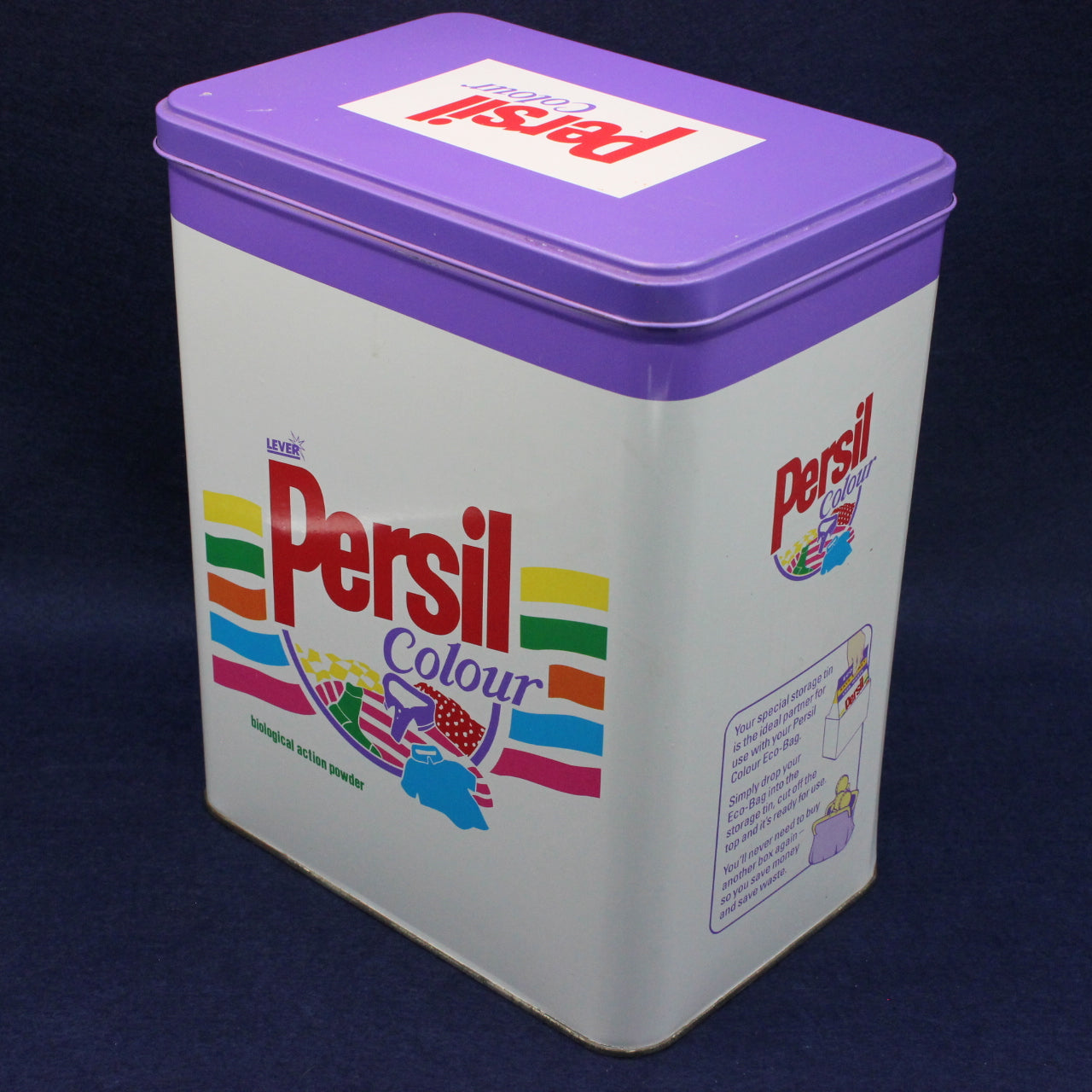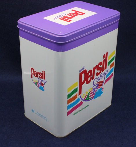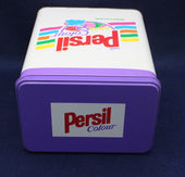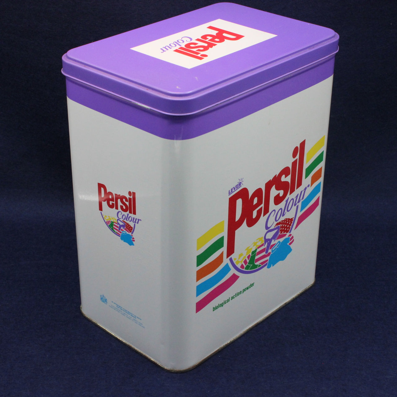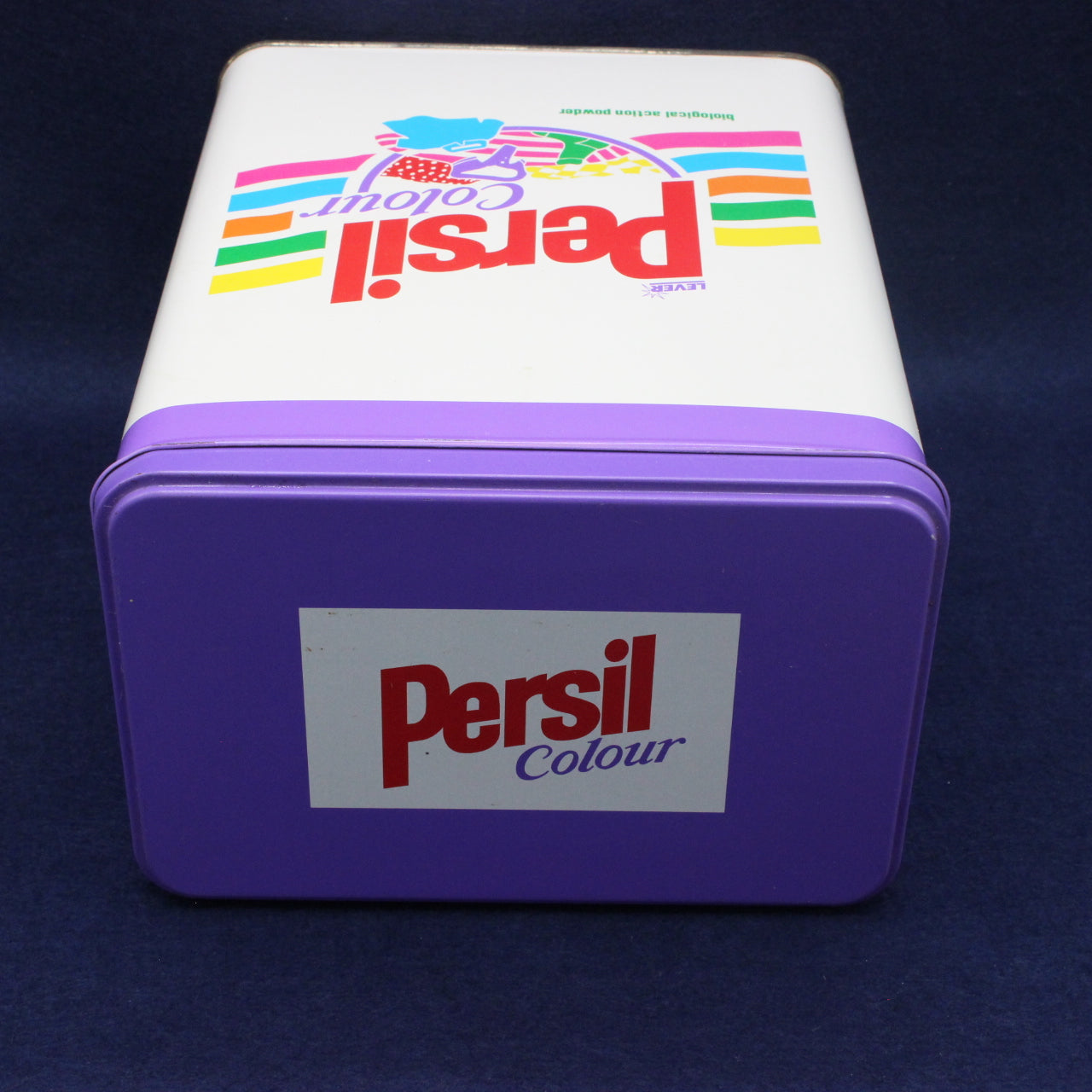 Designed as a practical storage tin, it reflects the era when washing powder brands produced reusable metal containers that customers often kept long after the detergent was gone. Its cheerful design and classic Persil styling make it an appealing choice for collectors of laundry memorabilia, advertising tins, and retro household packaging.