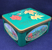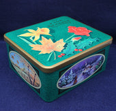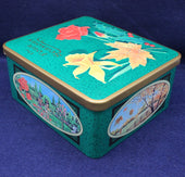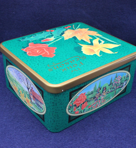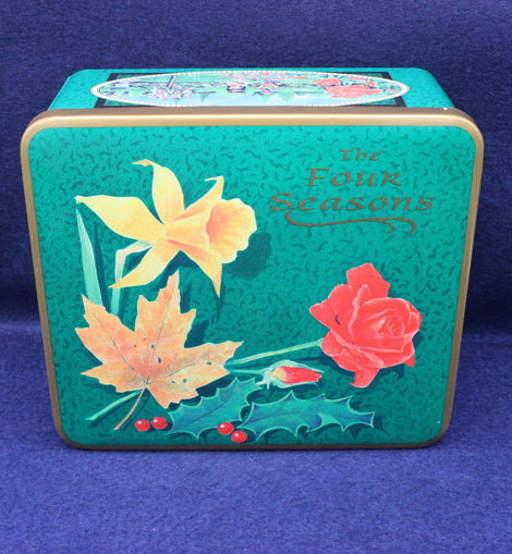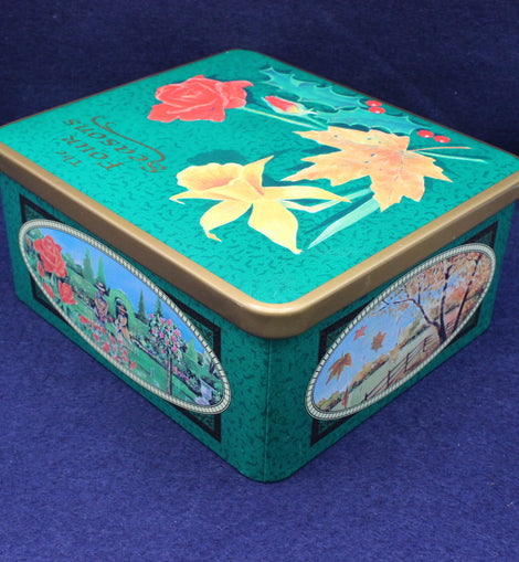 Decorative tin box with floral and landscape designs by Ringtons tea. Flowers from four seasons on the lid, images depicting the four seasons on the sides. Cracking tin for the collection. Approximate Size 17 x 15 x 8cm