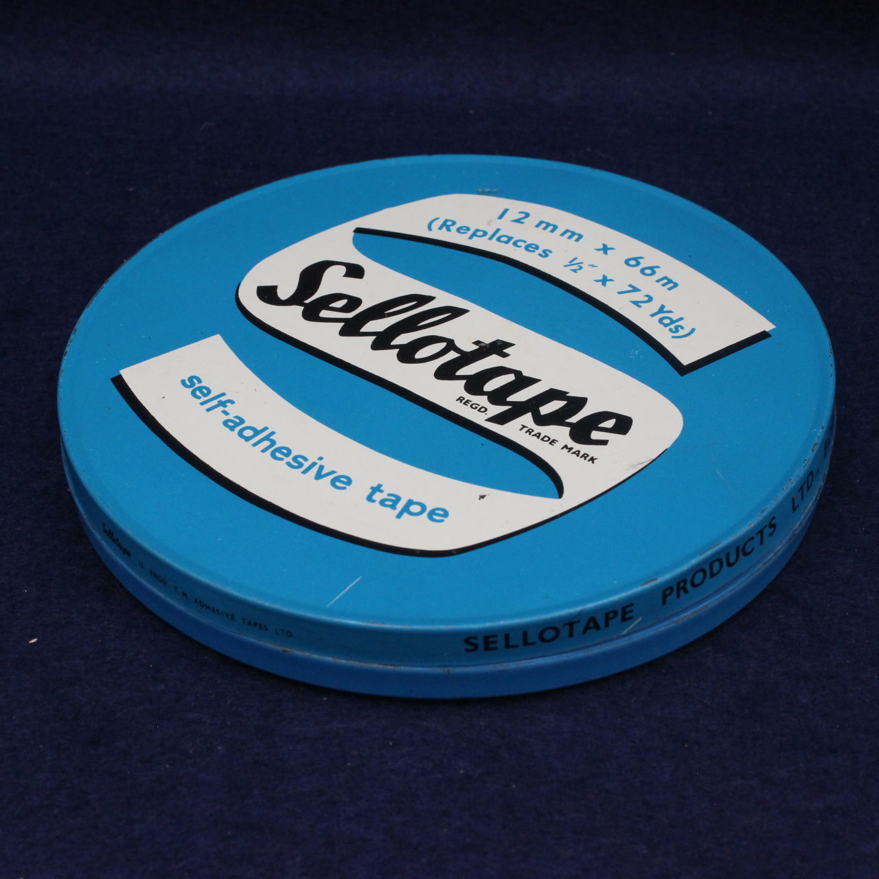 This vintage Sellotape self‑adhesive tape tin is a classic example of late‑1970s to early‑1980s British stationery branding. Featuring the iconic Sellotape script logo displayed across a stylised white ribbon on a bold blue background, it captures the clean, practical design language of the era. The tin lists the tape size in both metric and imperial — 12mm x 66m (replaces ½" x 72 yds) — a hallmark of UK packaging during the metrication transition.