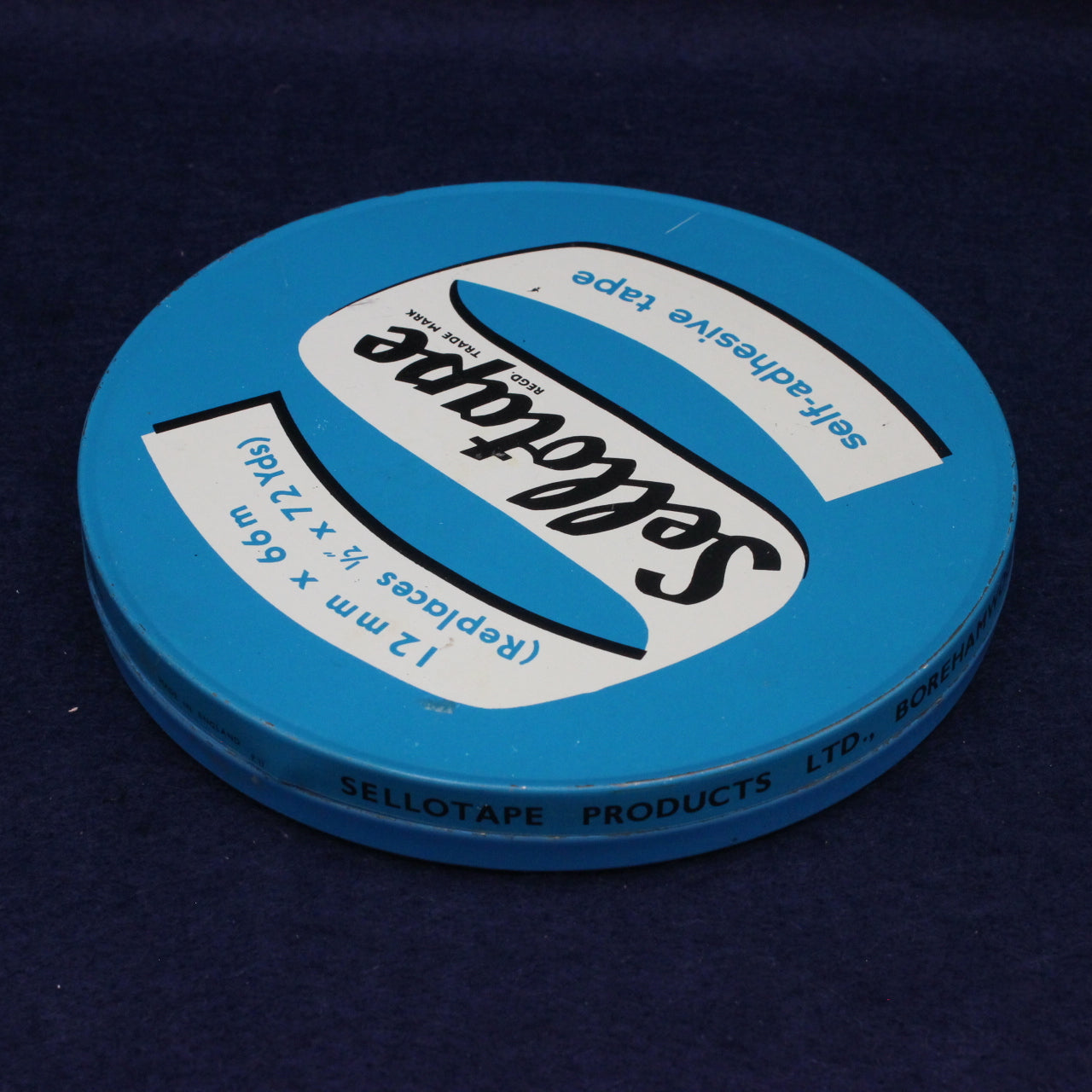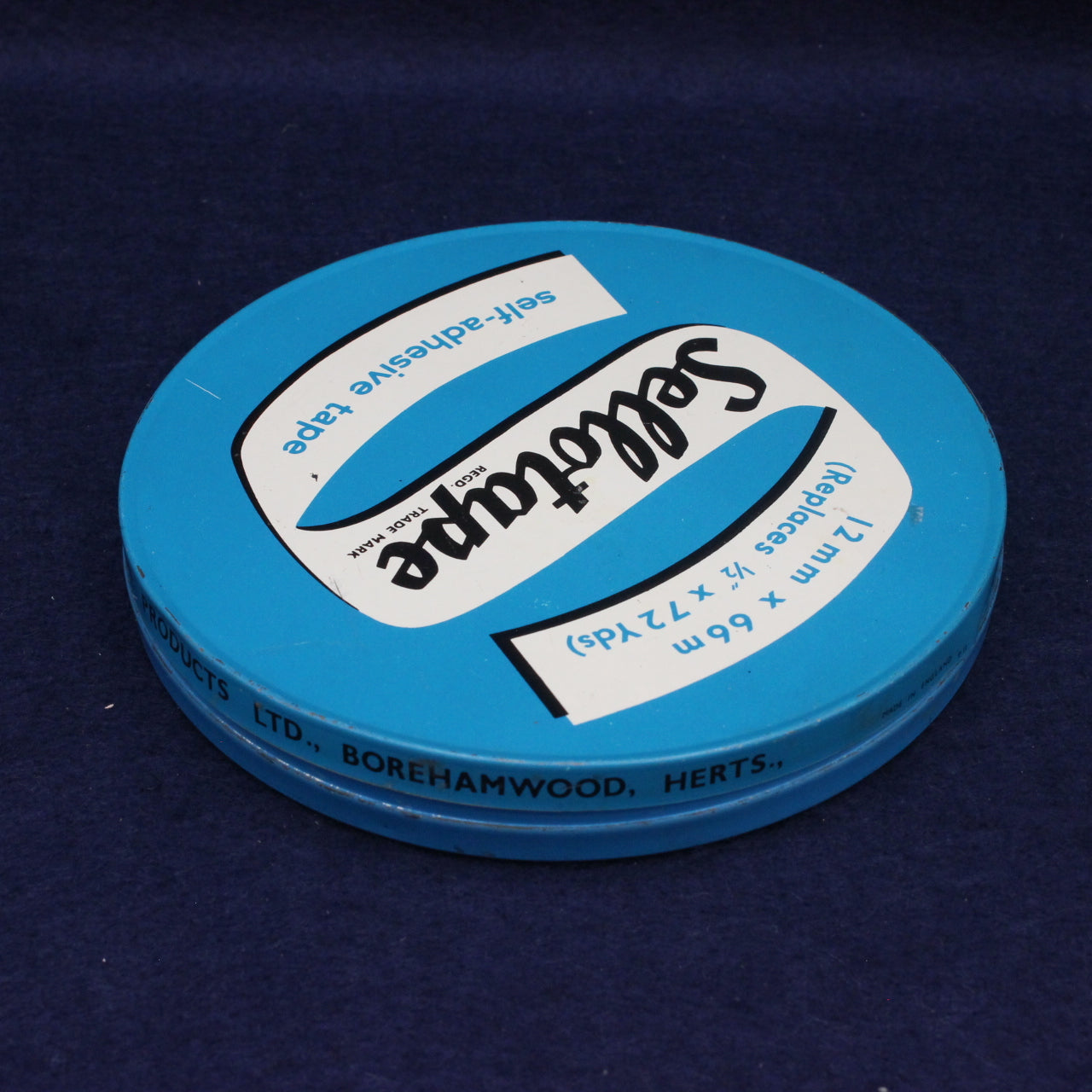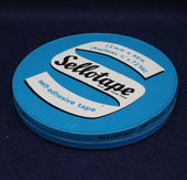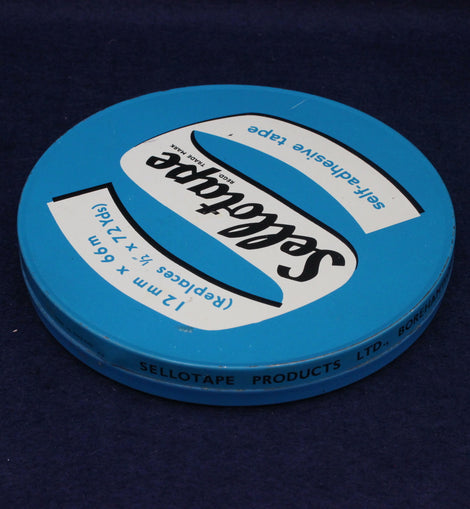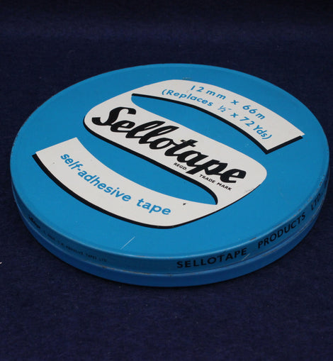 Sellotape has been a staple of British homes and offices since the 1930s, and by the 1970s it had become the generic name for clear adhesive tape. During the late 70s and early 80s, the brand used metal tins like this to protect tape rolls from dust and humidity — especially for office and industrial use.