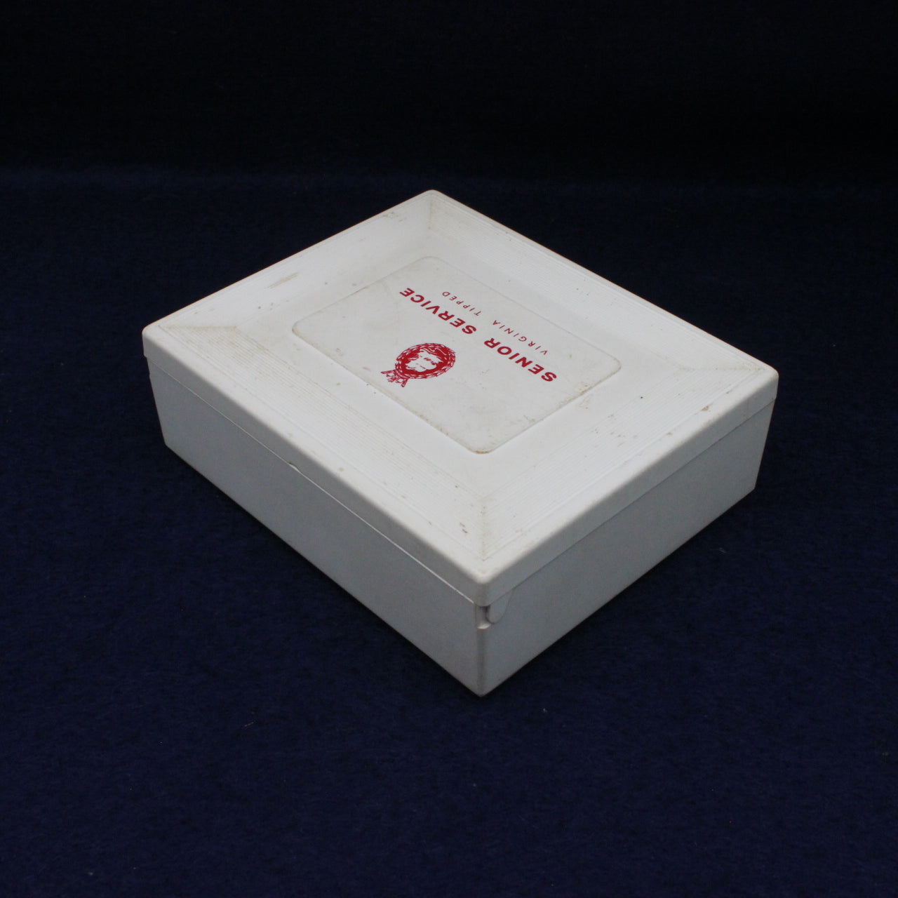 Compact and practical, the white plastic case opens and closes perfectly, offering both collectible charm and functional design. With authentic age‑related wear, it’s a nostalgic piece of promotional packaging that makes a perfect display item for collectors of vintage advertising boxes, decorators seeking a retro accent, or anyone who enjoys quirky tobacco memorabilia.