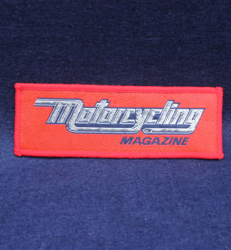 Vintage Sew on badge. Red patch with 'Motorcycling Magazine' text on a dark red background
