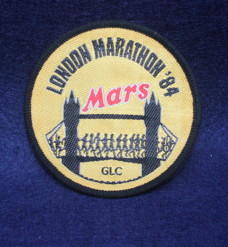 Vintage Sew on Badge Mars London Marathon 1984. Yellow black and re with London Bridge.