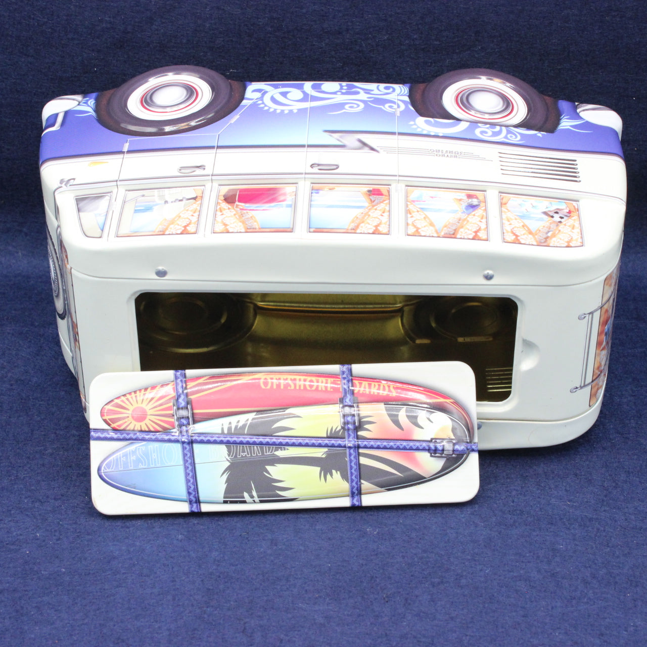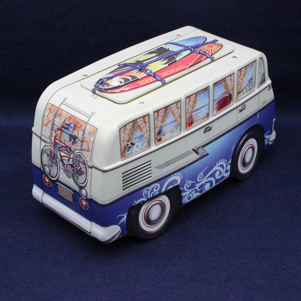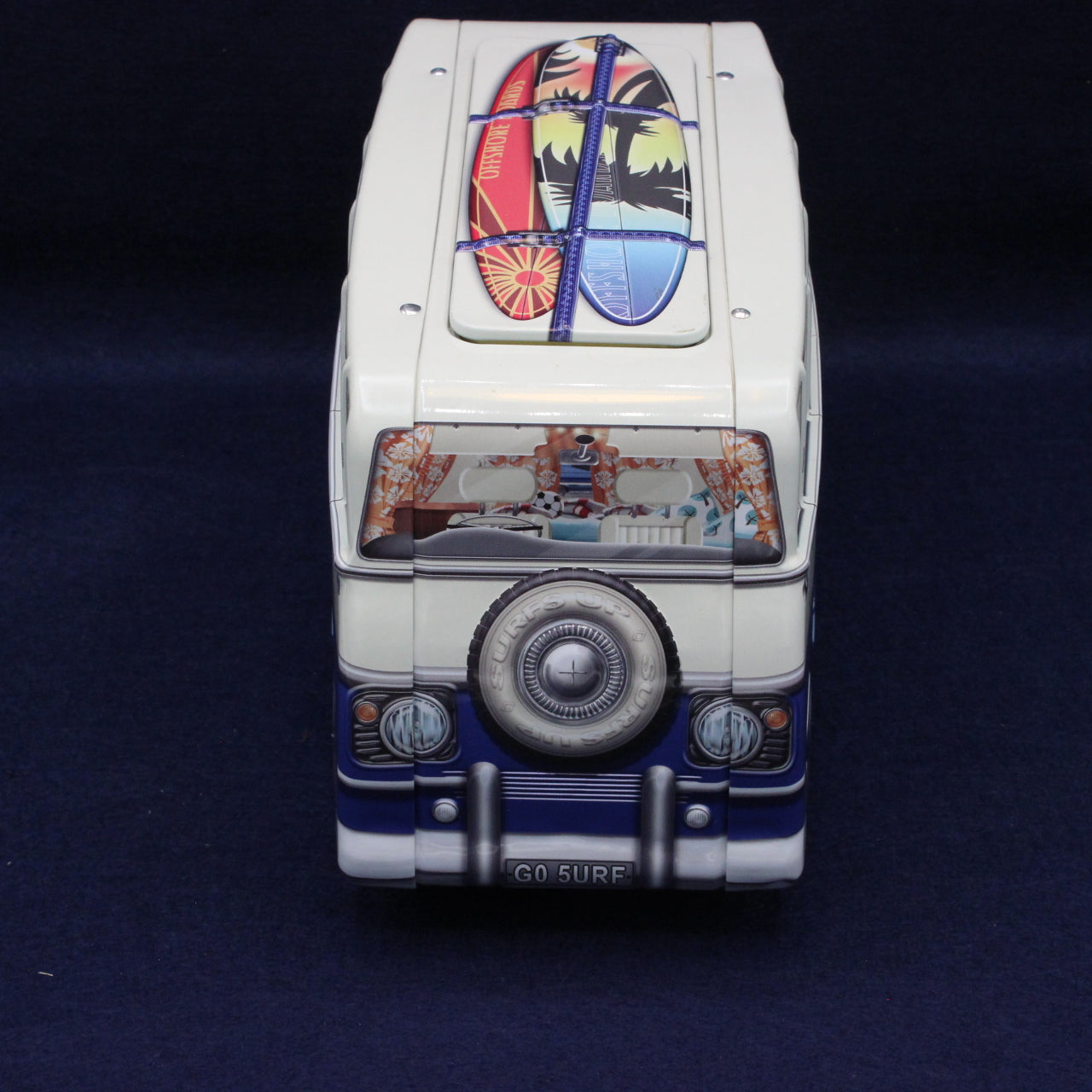 Bring a touch of seaside nostalgia to your collection with this delightful campervan‑shaped biscuit tin. Finished in ocean blue and cream, the tin features a lift‑off roof lid styled as a surfboard and a playful number plate reading Surfs Up.