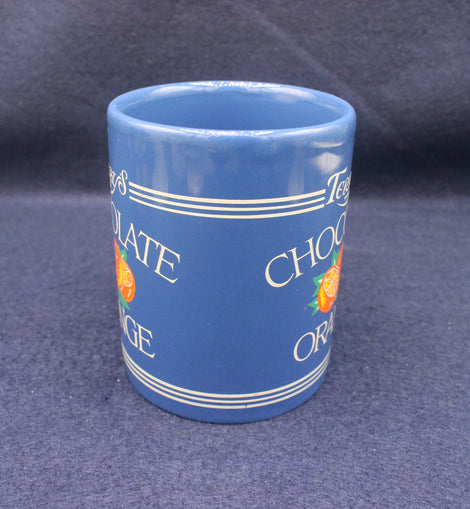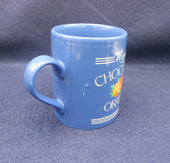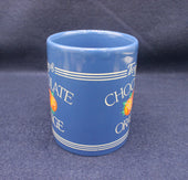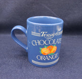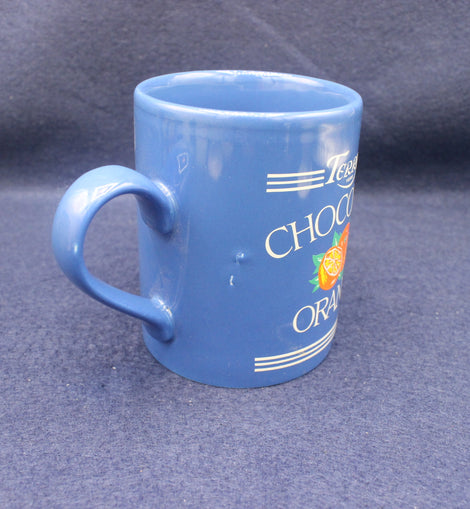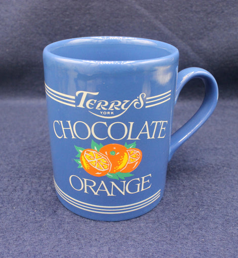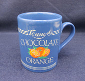 Dark blue mug with Terry's Chocolate Orange silver text. Oranges and green leaves in the centre of the mug. Nice unused collectors mug though has a slight factory imperfection on one side near the handle.