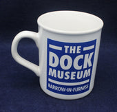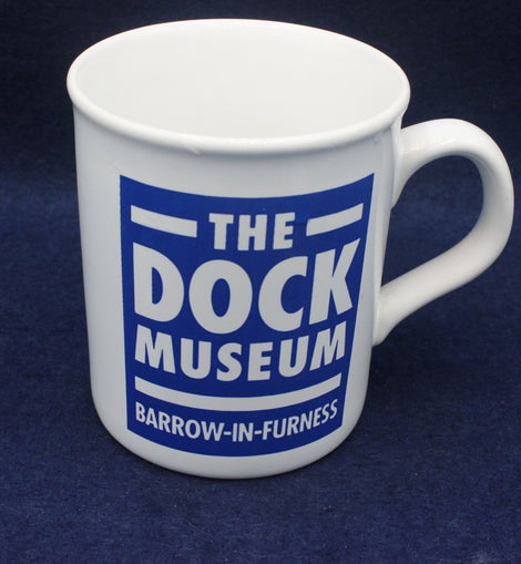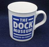 White mug with white text on a blur background: 'The Dock Museum Barrow-in-Furness.' Collectors gift mug.