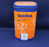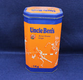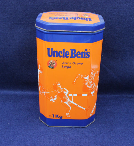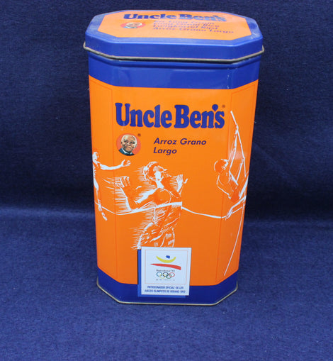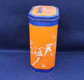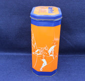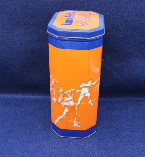 Vibrant tin in orange and blue. Various images of athletes in action. Celebration collectors tine for the 1992 Barcelona Olympics. 11 x 8.5 x 19.5cm high