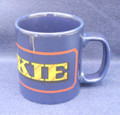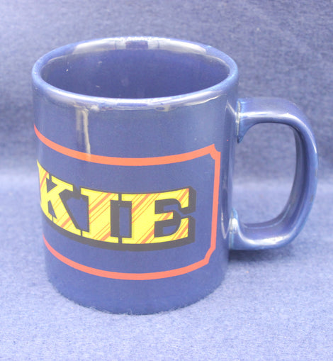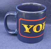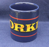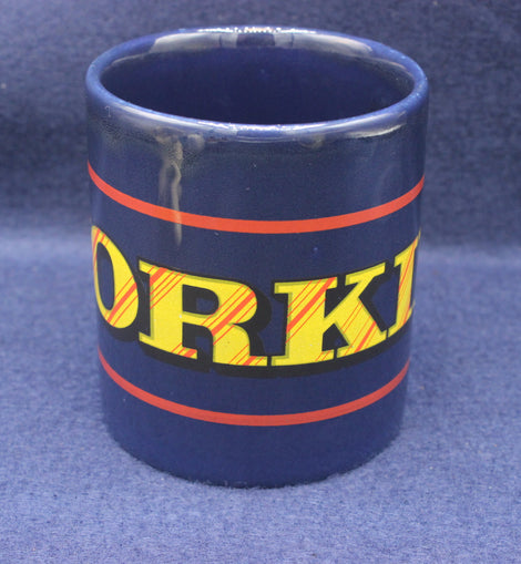 Chunky dark blue Yorkie mug with red accent and yellow logo. Yorkie is a chocolate bar made by Nestlé. It was originally made by York based company Rowntree's, hence the name Yorkie.