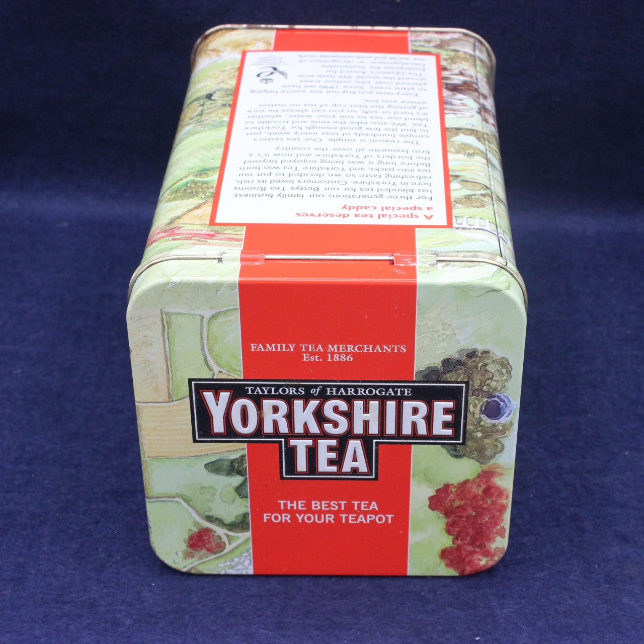 Tea tins became popular in Britain from the Victorian era onward, valued for their durability and ability to keep loose‑leaf tea fresh. By the late 20th century, brands like Yorkshire Tea embraced colourful countryside imagery to reinforce their connection to rural Yorkshire and the idea of “proper” tea made with care.