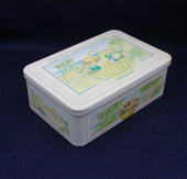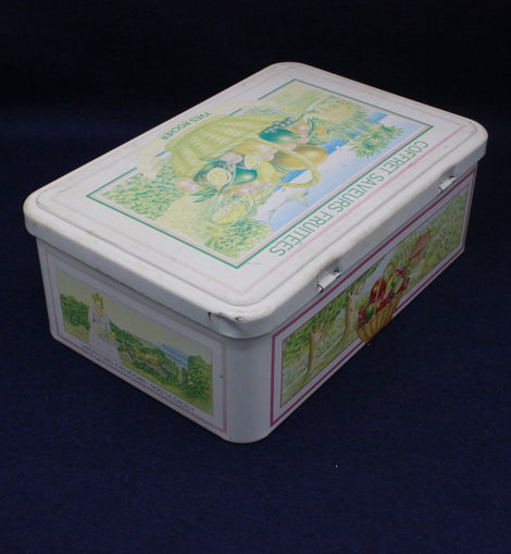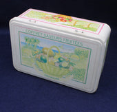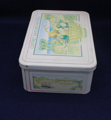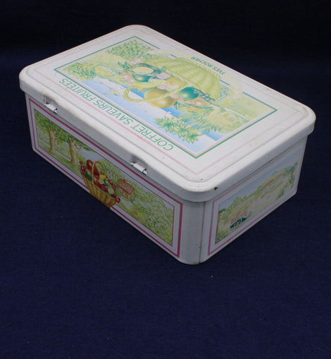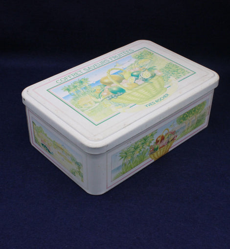 A charming vintage Yves Rocher gift tin from the Le Coffret Saveurs Fruitées range, decorated in the brand’s signature botanical style. With its soft colour palette, fruit‑themed illustrations, and elegant French cosmetics branding, it captures the warm, natural aesthetic that defined Yves Rocher packaging throughout the late 20th century.