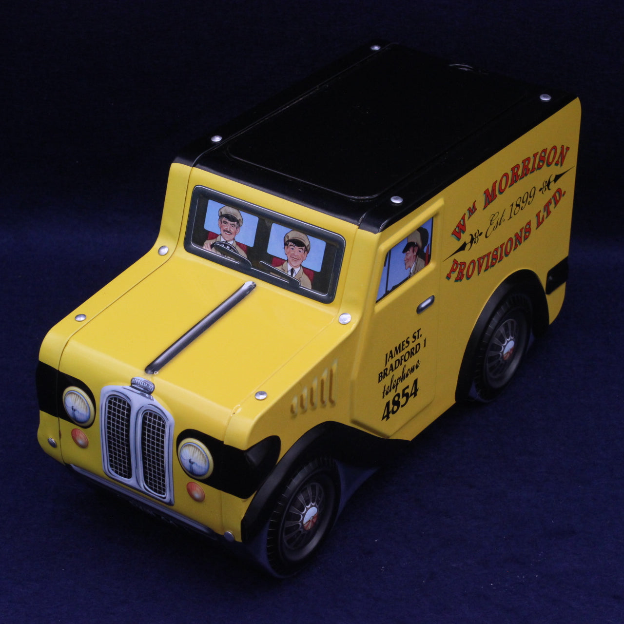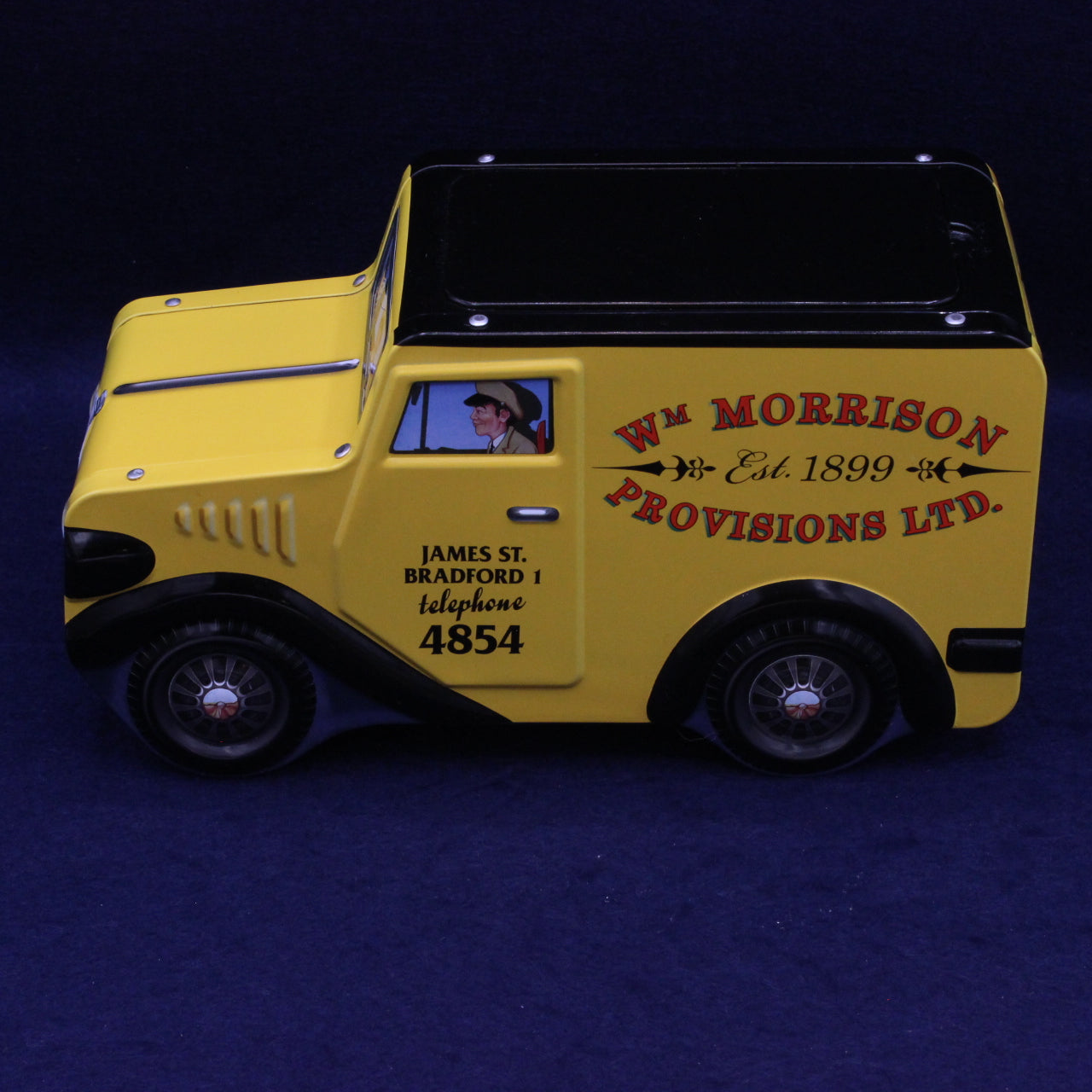 The design of this tin pays homage to the early days of WM Morrison, founded in 1899 as a market stall in Bradford. Delivery vans like the one depicted became a familiar sight as the company expanded through the early and mid‑20th century.